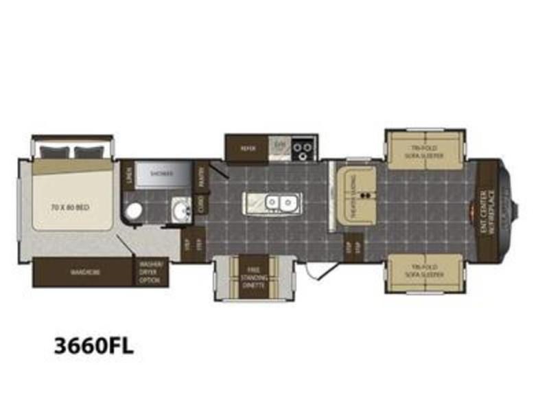SIX slides in a fifth wheel? You will be amazed at the space inside this Alpine fifth wheel by Keystone RV. Model 3660FL has a front living room layout and slides that provide maximum space in every area of this unit.