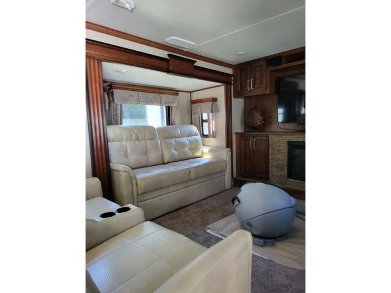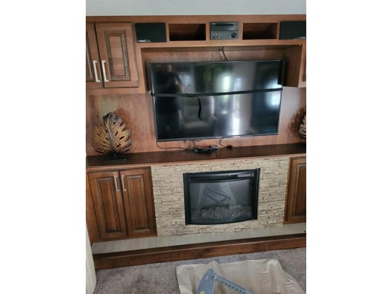 Head up the steps to your right from the kitchen to a front living space also featuring dual slides. There is an entertainment center with a fireplace along the front wall. In the living room you will find dual opposing slides, and each slide has a tri-fold sofa sleeper. Across from the entertainment center there is theater seating with cup holders. The perfect place to entertain, relax, and provide sleeping space for extra guests if needed.