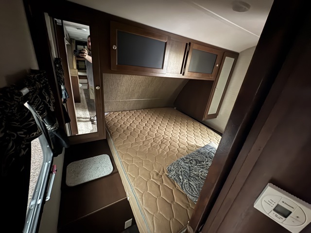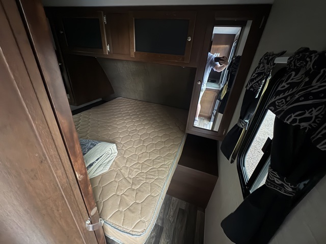 The front bedroom features a queen bed with wardrobes on both sides of the bed. There is also a laundry chute and overhead cabinets, plus sliding privacy doors when needed.