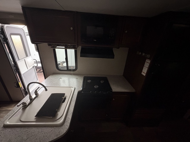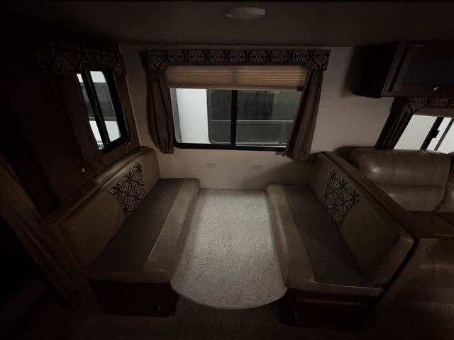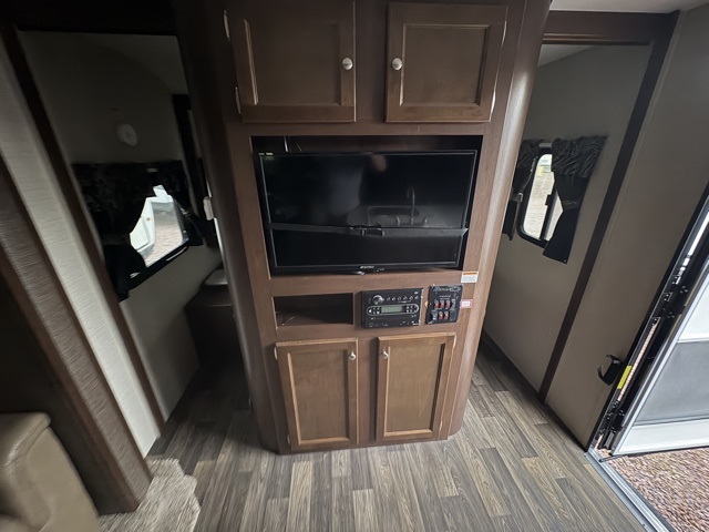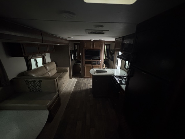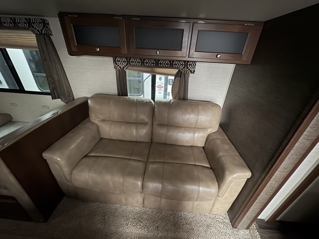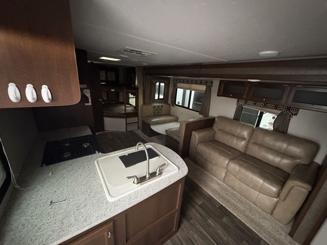 Step inside the main entry door closest to the front of the trailer to find a spacious interior with large slide out 68" sofa and booth dinette. When it's time for relaxing, the entertainment center is along the interior center wall facing the kitchen/living area.