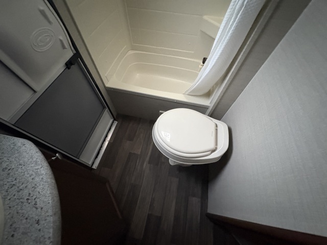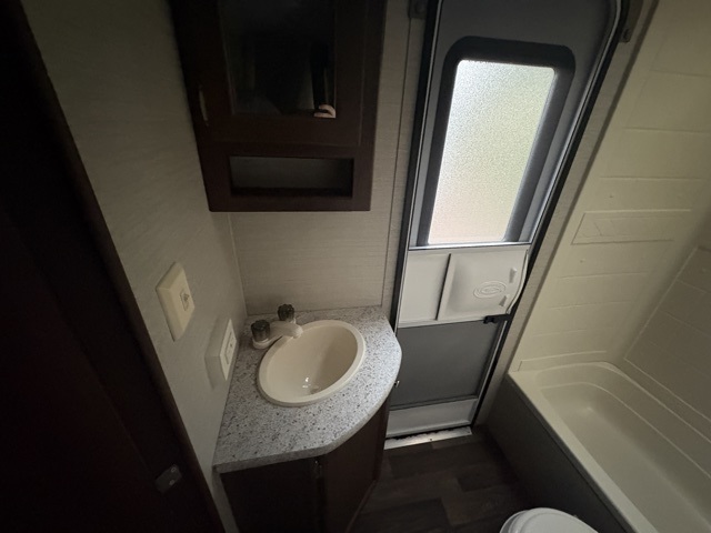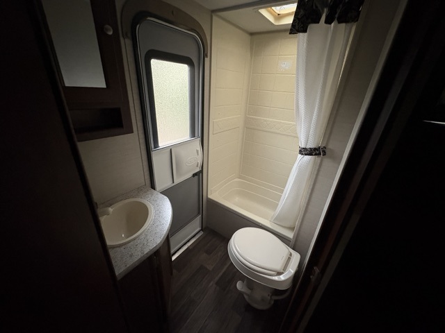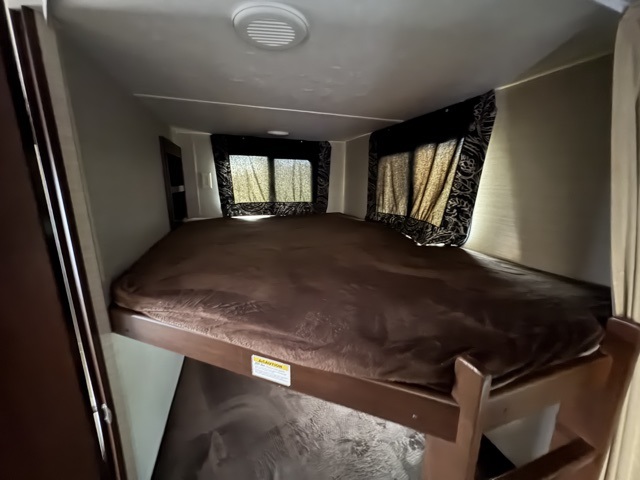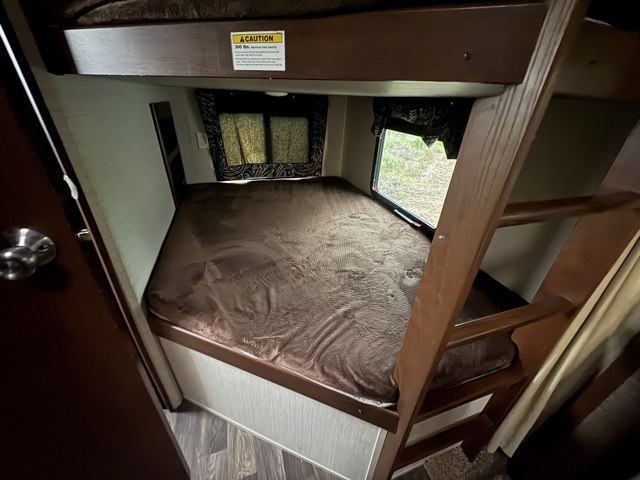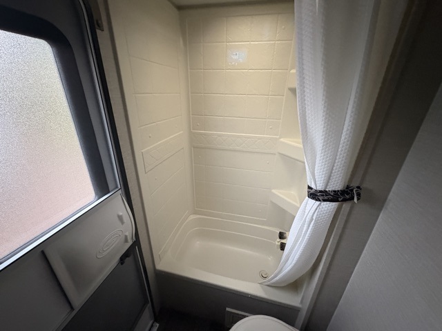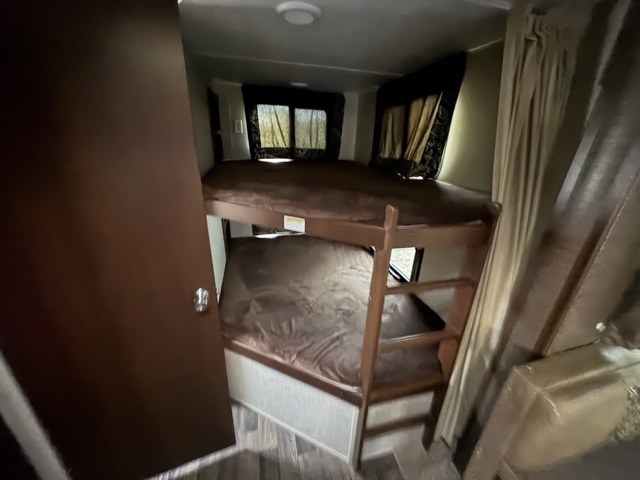 In the rear there is a a set of double size bunks with an angled corner and ladder for accessing the top bunk, plus a privacy curtain. The opposite rear corner features a full bath with private entry from outside, and includes a tub/shower, toilet and sink.