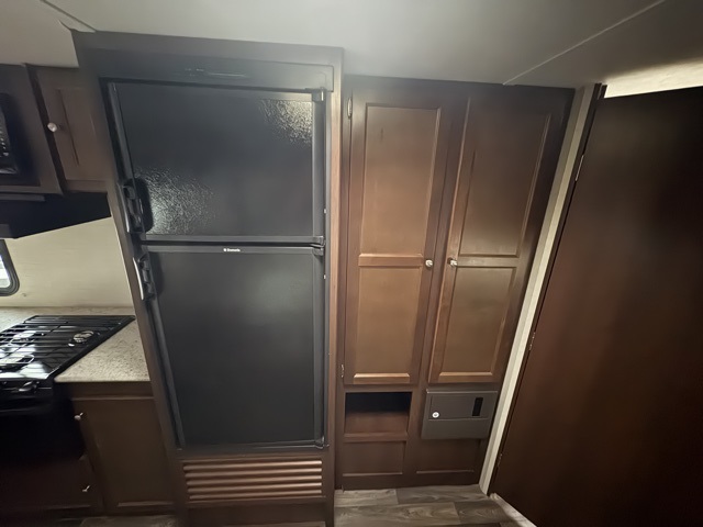 On the curb side you will find a kitchen that has everything you need to create gourmet meals and snacks on the go. There is a refrigerator, three burner range, overhead storage, and large kitchen sink on a L-shaped counter. There is also plenty of overhead storage space for dry goods, dishes, and so much more. You will find even more storage next to the refrigerator with a double door pantry/wardrobe.