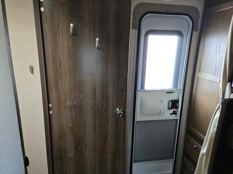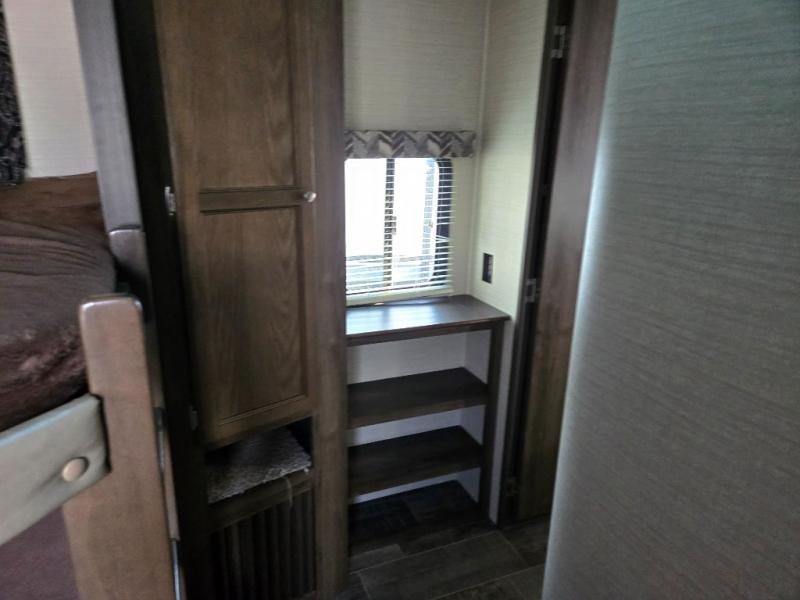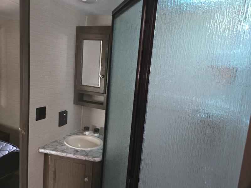 Heading towards the front, the bath is on your right side. The bath includes a angled shower, toilet, and sink with medicine cabinet. Plus there is a second entry door from the bedroom. The bedroom also has a hallway entrance, a queen bed, dual wardrobes, and a laundry chute as well.
