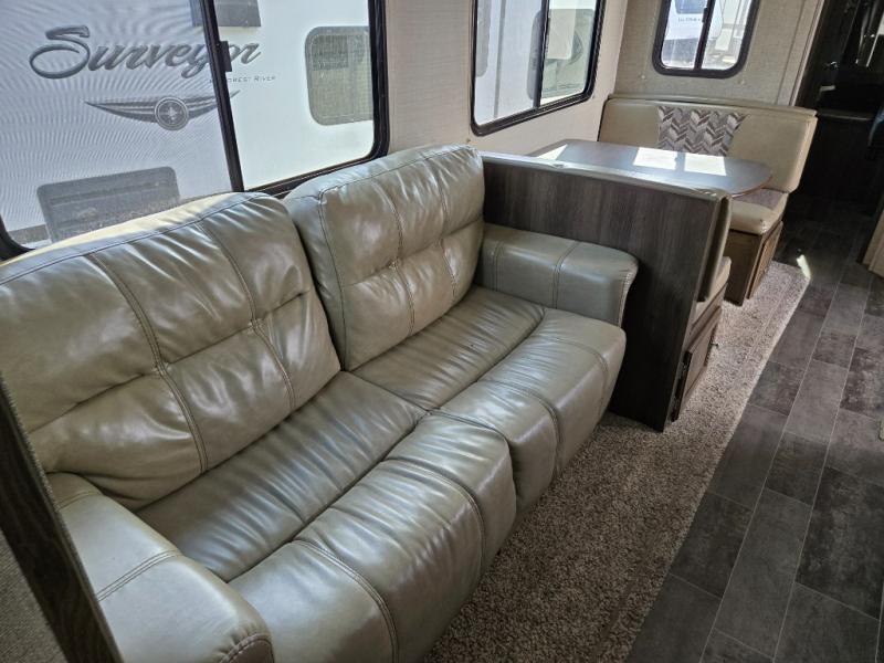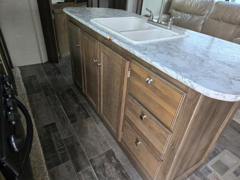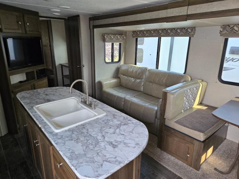 Step inside the main entrance of model 330BHS to find an open living area in this travel trailer. To your left is the first slide out including a three burner range, counter space, and a refrigerator. A kitchen island including a double sink is between the two slide outs. The second slide features a booth dinette, and sofa with overhead storage. A pantry for your non-perishables is next to the sofa. And the entertainment center is on the outer wall of the half bath for easy viewing from anywhere in this space.