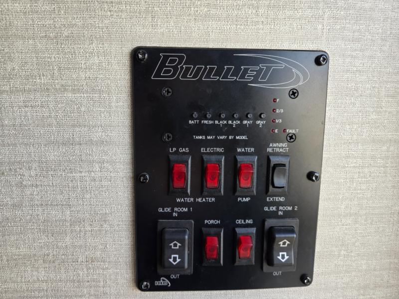 This Keystone Bullet features a bunkhouse with it's own private entry from outside including a half bath, dual opposing slides in the main living and kitchen area, plus a private front bedroom, and so much more.