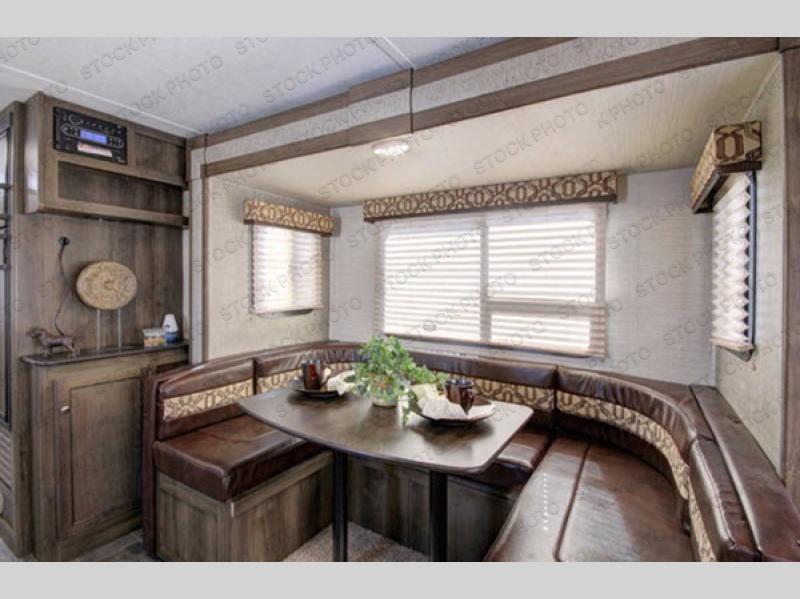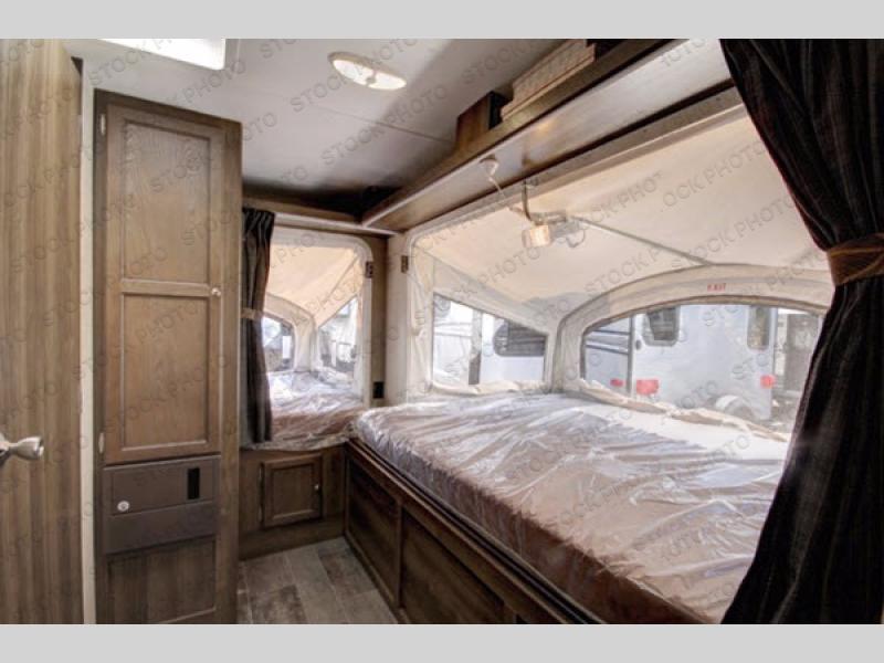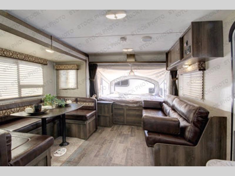 Step inside 2190EX to your right to see a fold-down sofa. Next, the first queen tent end bed is along the front of the expandable. There is storage overhead as well as underneath the bed, plus a corner end table to place your things. A slide out u-shaped dinette for meals or playing games is opposite the sofa. The sofa and dinette also provide additional sleeping space at night if needed for family and friends.