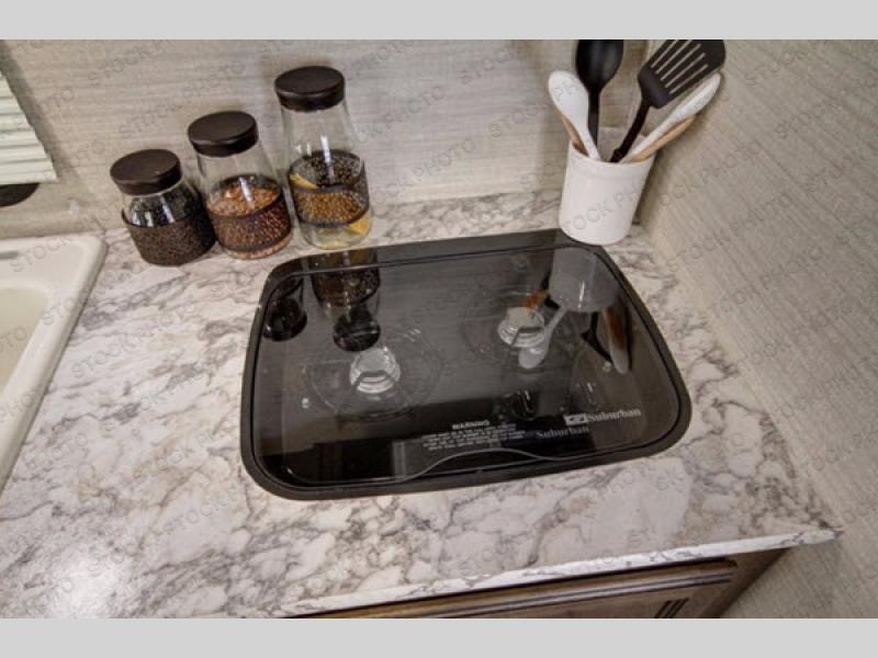 There is a large single sink, two burner range, and a refrigerator that will provide all the kitchen amenities for making meals on the go. You will appreciate the overhead cabinets and the under sink storage for placing your dishes, cleaning supplies, and dry goods.