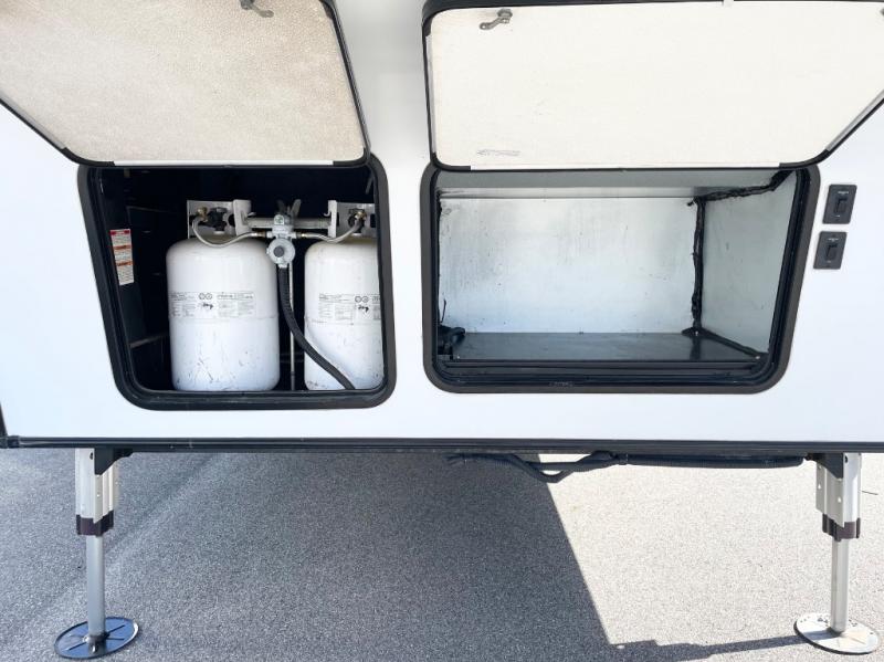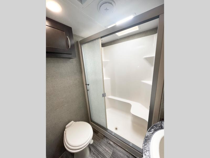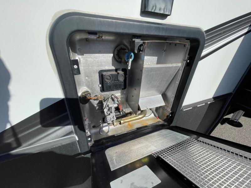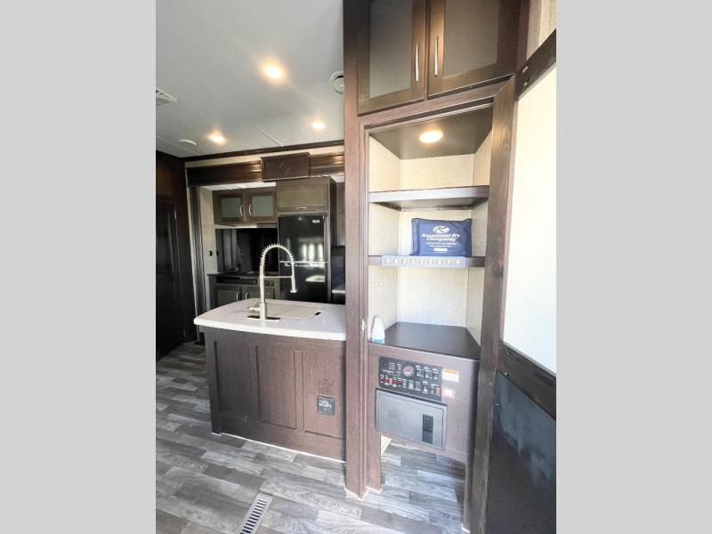 Step inside the living area and you will feel like you haven't left home. There are dual opposing slides which give it a wide open concept feel. Enjoy the 97" sofa with recliners to the left in a slide along with a dinette table for meals. The second slide out includes the entertainment center, refrigerator, three burner range, and overhead cabinets on the opposite side. A counter peninsula with a double kitchen sink including extra counter space along the interior wall, plus a pantry for dry food storage makes this kitchen a dream space for the cook in the family. A second pantry is in the corner just before you enter the cargo area.