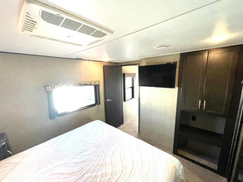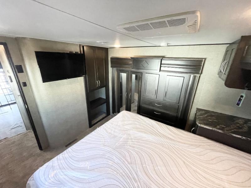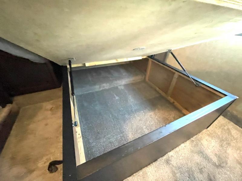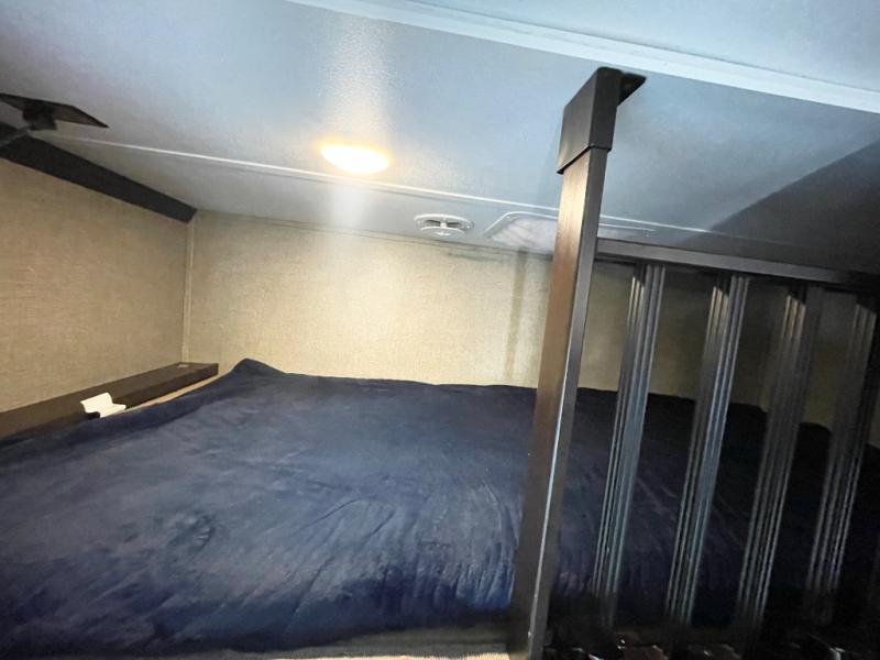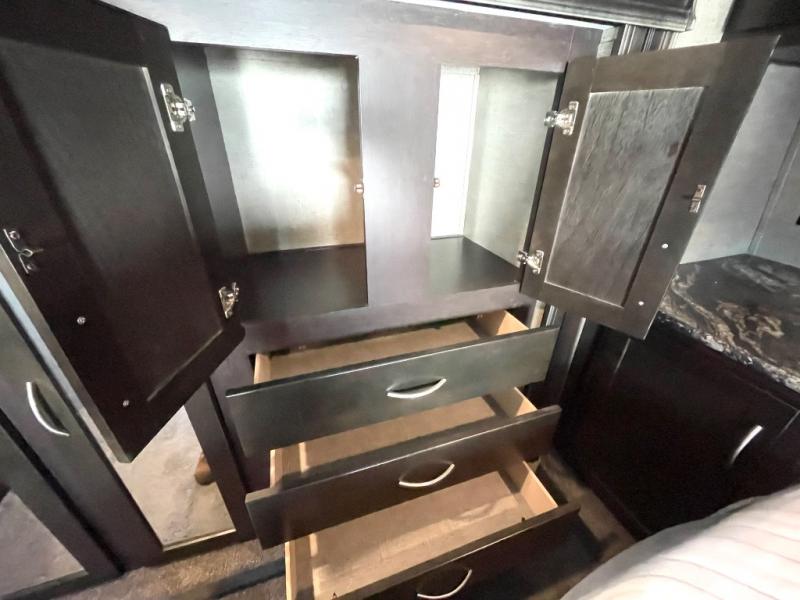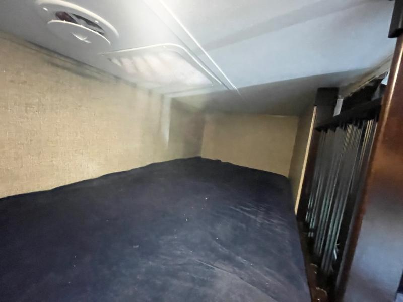 At the end of the hall enter the private master bedroom which features a queen size bed with dual nightstands, overhead storage, and a slide out wardrobe for your clothing, plus a smaller wardrobe with laundry chute along the interior wall, and more!