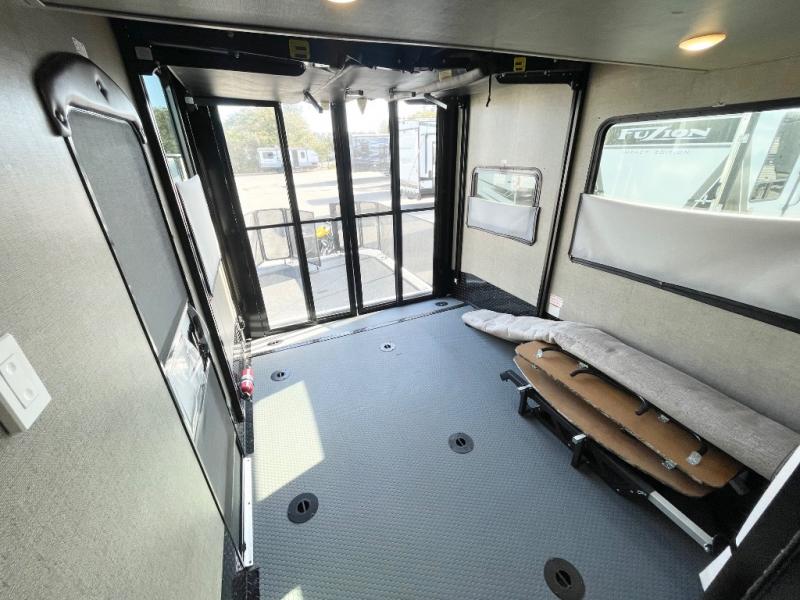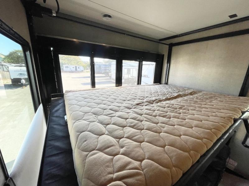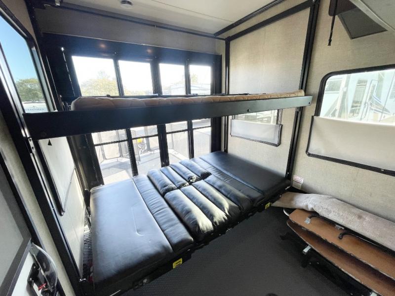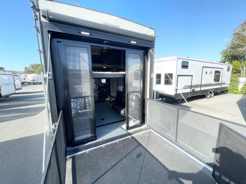 Head into the garage from inside, from the cargo side man door, or rear ramp opening. There are overhead cabinets for storage, and a twin loft at the front of the garage that overlooks the interior. You will also like the added sleeping and seating space with the overhead electric bed with dual opposing sofas below. Perfect for all the extra guests and family that will want to come along!