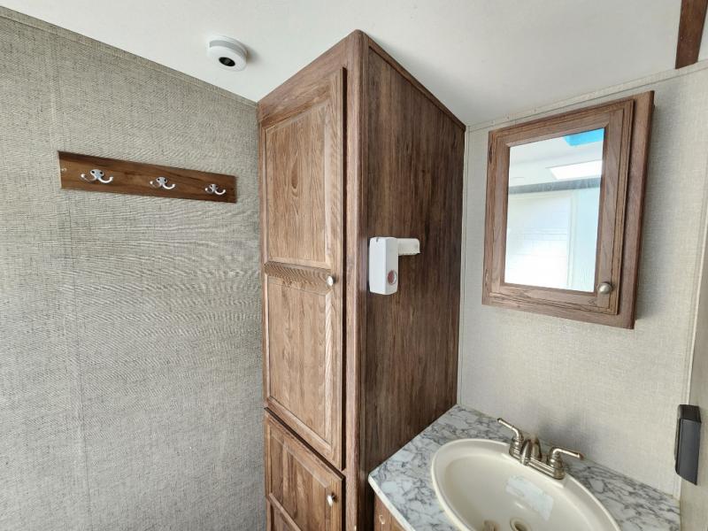 On the door side find to your left a kitchen slide out that includes a refrigerator, three burner range, plus counter and overhead storage space, as well as lower cupboards too. An adjacent pantry is large enough to store all of your extra things, and the convenient kitchen island features plenty of extra prep space, plus a large sink.
