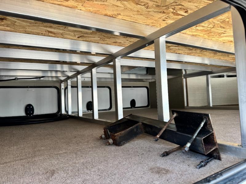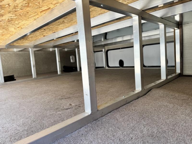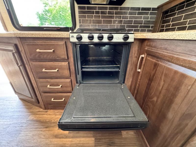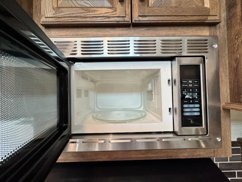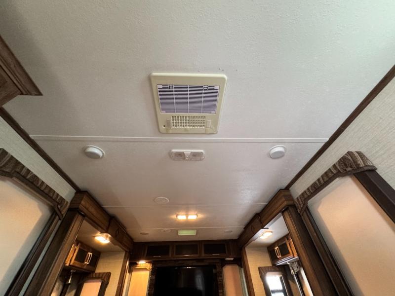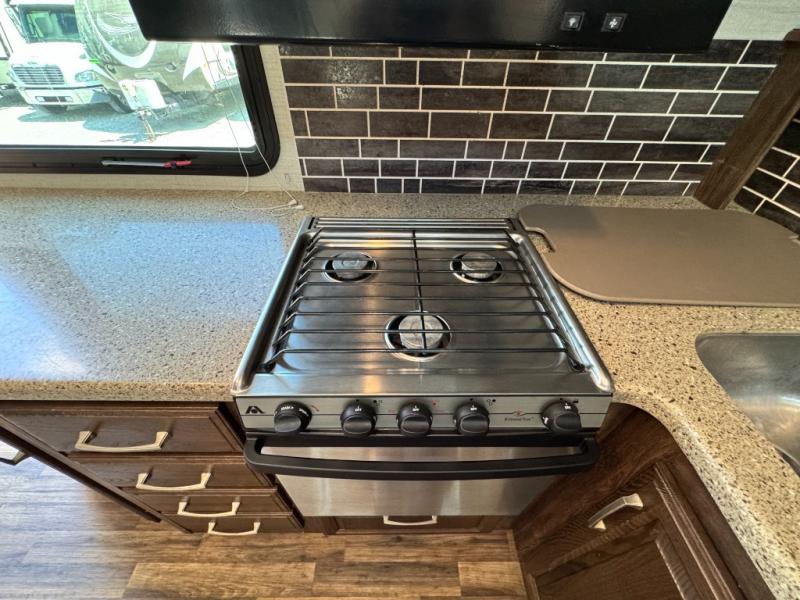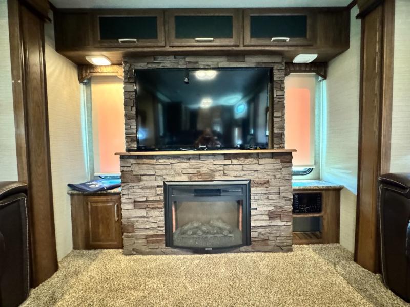 Located in the rear of this model is the living area. Here you will find dual opposing slides with tri-fold sleeper sofas and overhead cabinets. There are also theater seats with cup holders, and along the rear wall enjoy the entertainment center, and more!