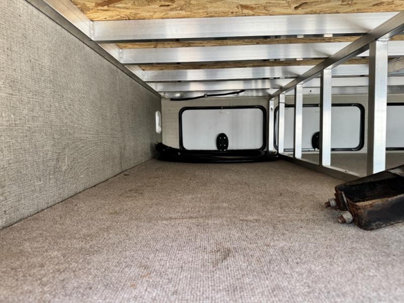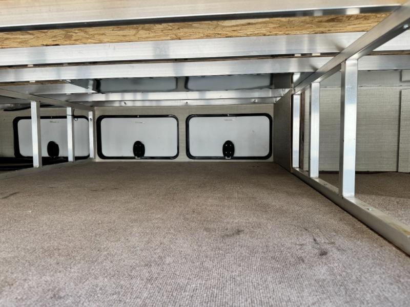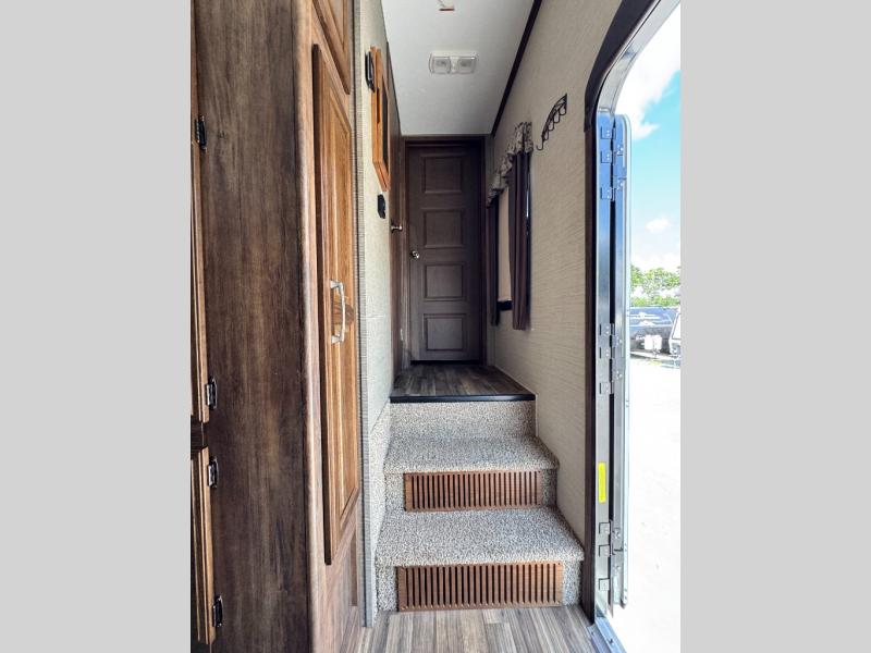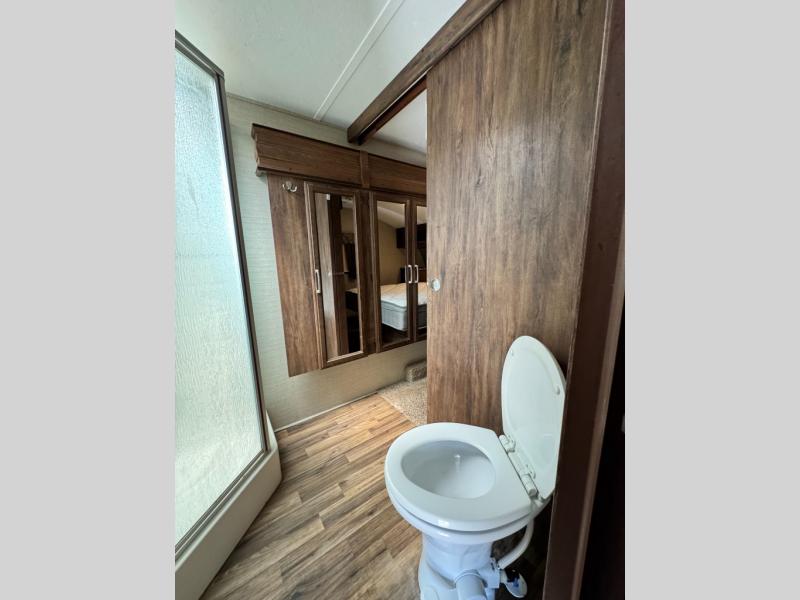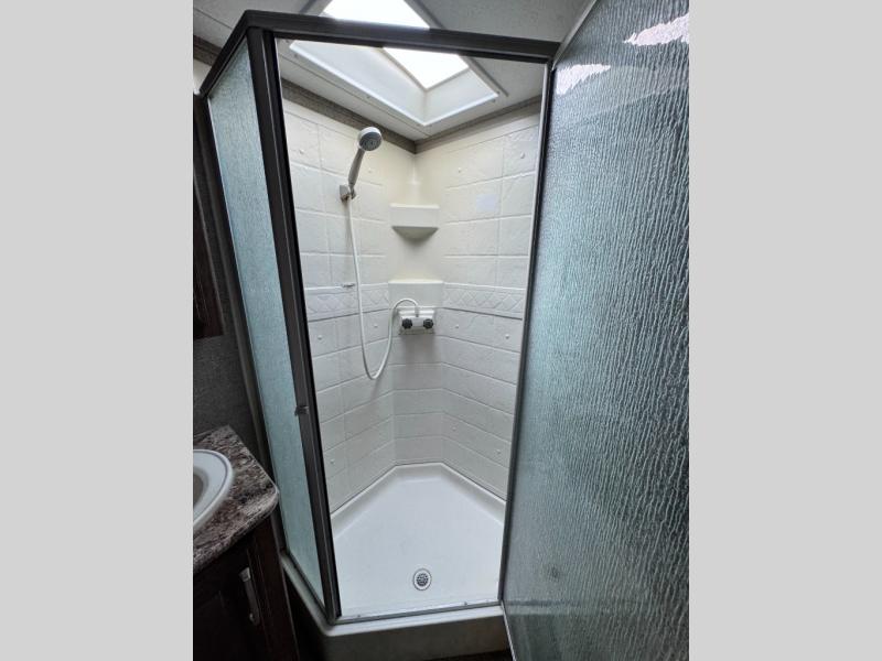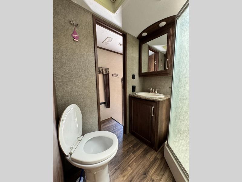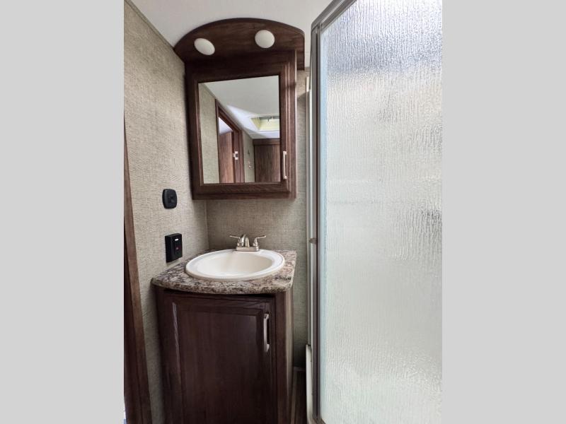 Step up to the bathroom and bedroom area. The side aisle bathroom is on your left. Inside the bathroom you will find a sink, medicine cabinet, neo-angled shower, and a toilet. There is a sliding door that separates the bathroom from the bedroom.