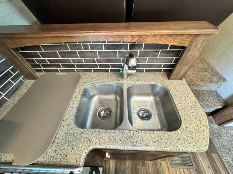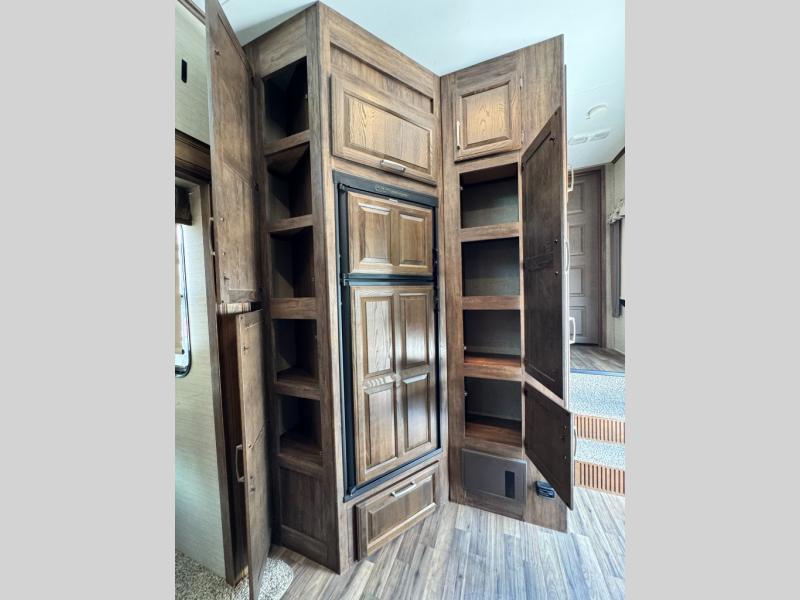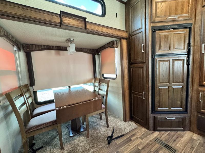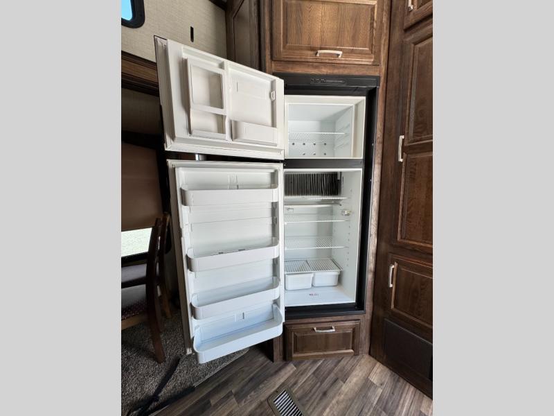 As you enter the fifth wheel, to your left there is counter space for food prep, overhead cabinets, three burner range, and double kitchen sink. On the opposite side the road side slide has a free-standing dinette. Adjacent to the slide there is a pantry, refrigerator, and an additional pantry.