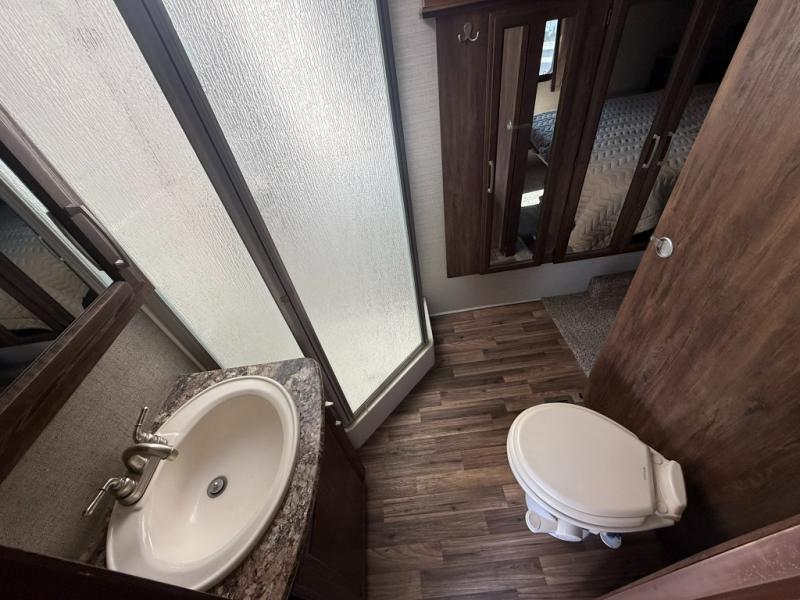 Step up to the bathroom and bedroom area. The side aisle bathroom is on your left. Inside the bathroom you will find a sink, medicine cabinet, neo-angled shower, and a toilet. There is a sliding door that separates the bathroom from the bedroom.