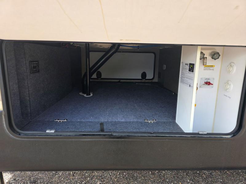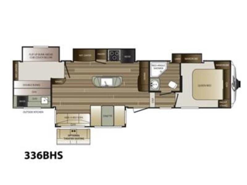 What I liked most: Longer and wider kitchen island gives extra storage. In the bunkhouse the 3 bunks and also the couch are all able to watch TV plus there are many storage compartments with 6 drawers and 7 cabinets. Main controls are hidden giving this rv a cleaner look. The bedroom has a nice night stand with 2 drawers and a small counter top which has a charging station for phones right above it. Theater seating is cool as it's straight across from the TV.