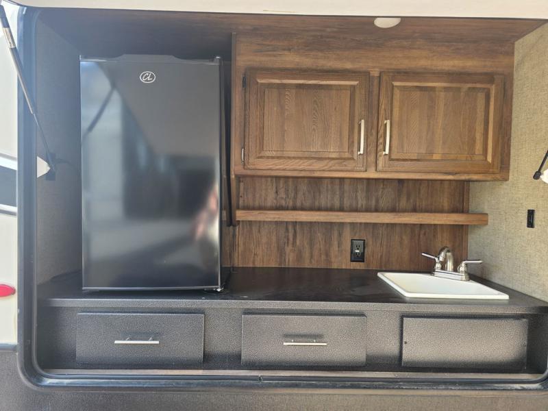 On the outside you will find an outdoor kitchen that the chef in the family will love. There is a refrigerator, single sink, plus overhead storage, and so much more!