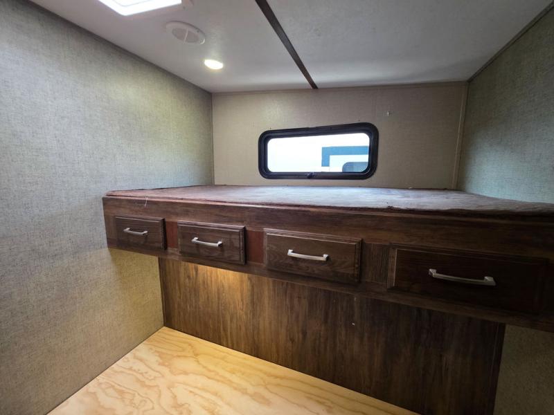 Back through the main living space head to the rear which is where you will most likely find the kids hanging out. There is a slide out jack knife sofa with flip-up bunk above on the right, and a set of bunks on the left. Straight ahead through the bunkhouse door you will see an entertainment center. There is also a wardrobe just inside the door on your left for storage needs, as well as drawers beneath the bunks, and beneath the TV area too.