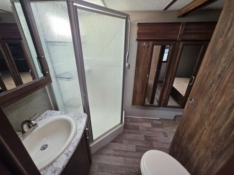 Head up the steps in front to a side aisle bath and front bedroom. The bathroom features a neo-angled shower, sink, and toilet, plus a slide out linen cabinet that is found along with the bedroom wardrobe slide.