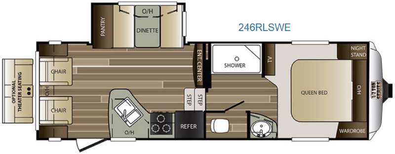 Step inside and notice the seating along the rear wall with an end table between the lounge chairs, and overhead storage cabinets as well. You can choose optional theater seating for two if you like. Adjacent you will find a slide out pantry and booth dinette. The overhead storage above the dinette will help keep things neat and organized inside.