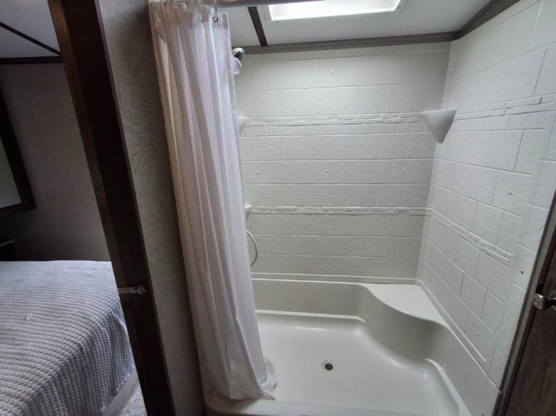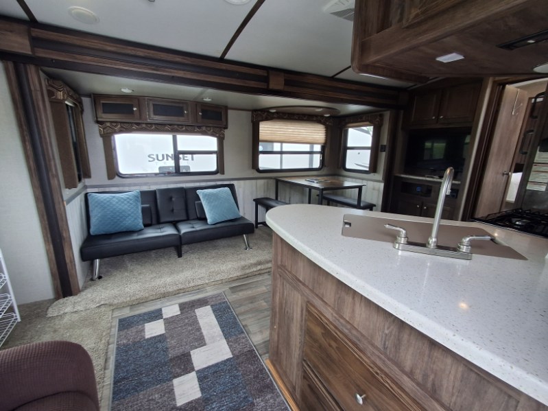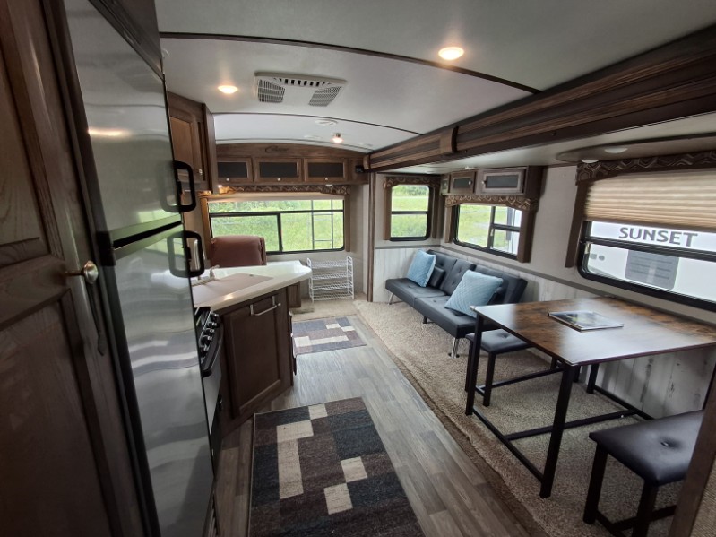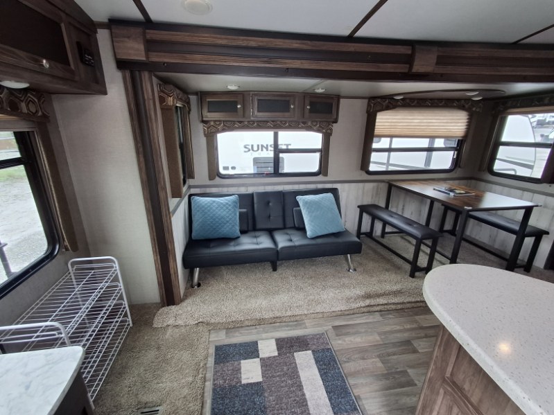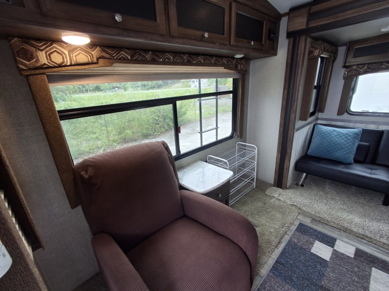 Enter the rear most side door and find two recliners plus an end table between along the rear wall. There is also an overhead cabinet the entire width of the room to help keep things neat and organized. Straight ahead you will find a hide-a-bed sofa and u-shaped dinette slide out for seating and added sleeping space at night. There is also an entertainment center along the interior wall for your enjoyment.