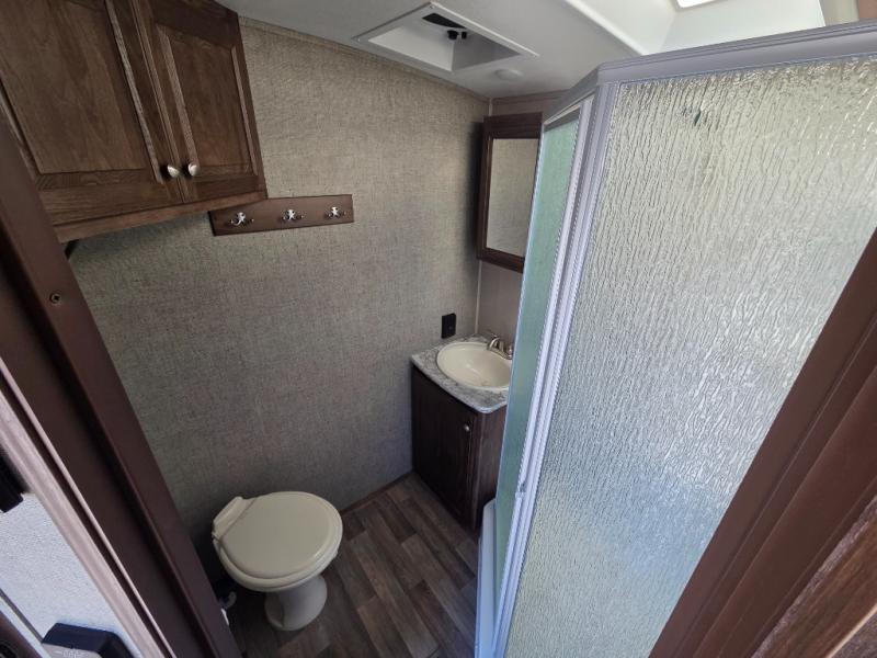 Along the rear wall there is a large closet. Also in the rear of the trailer is where you will find the bathroom with a toilet, corner linen cabinet, sink, and angled shower.
