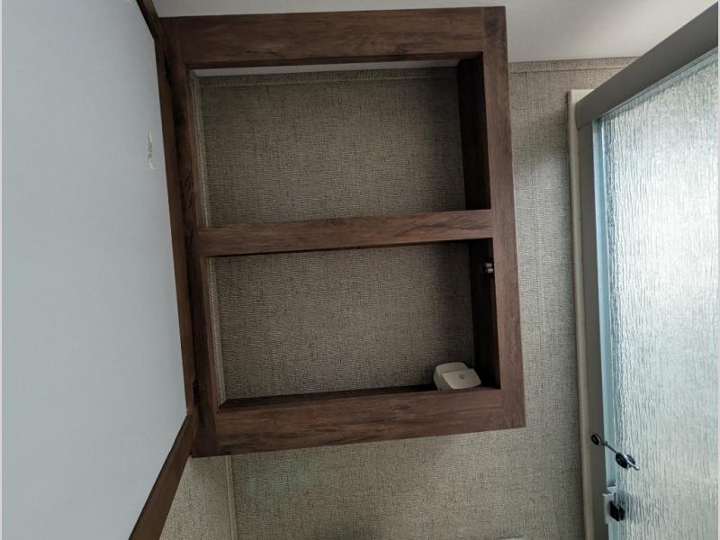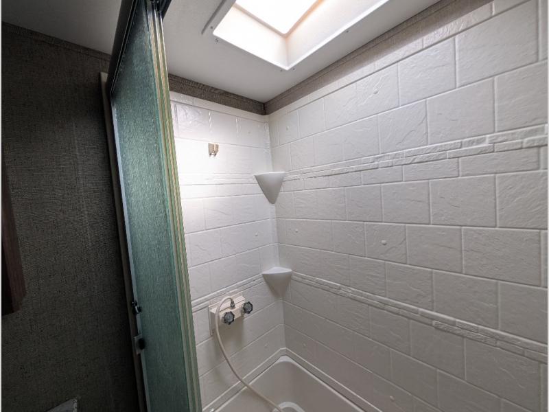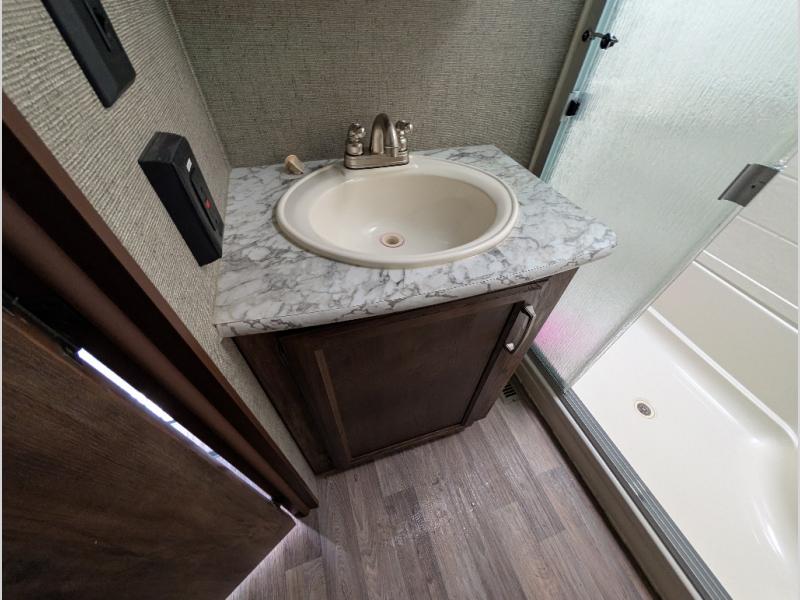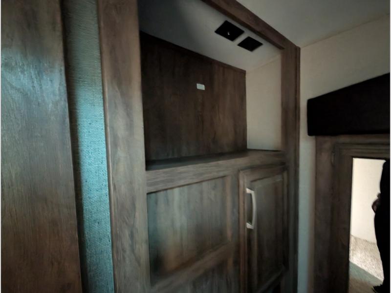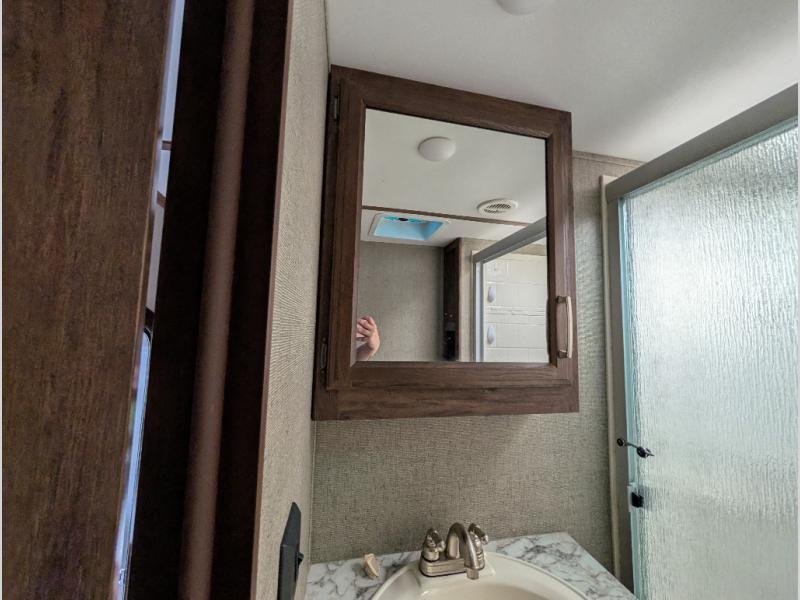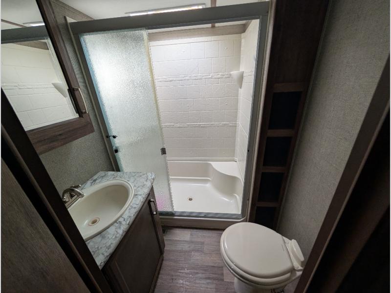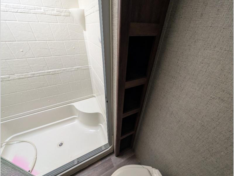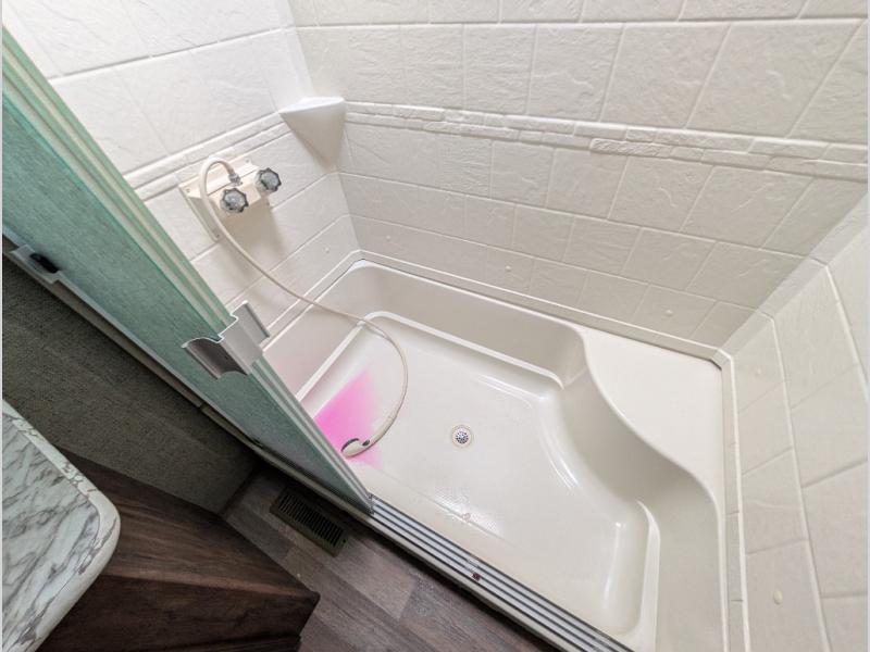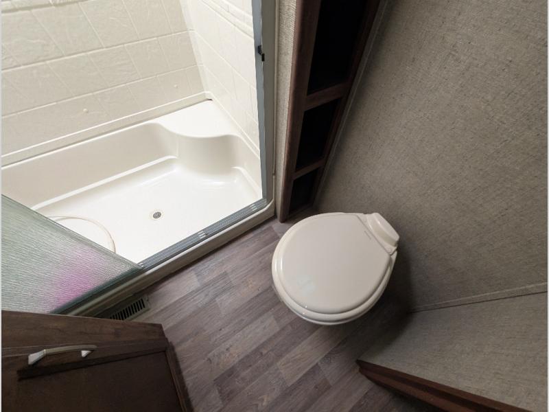 As you enter this model, you will be in the combined kitchen and living area. To your left there is a l-shaped counter with a double sink, three burner range, refrigerator, and overhead cabinets. Next to the refrigerator, on an angle you will find an entertainment center to enjoy. Along the rear wall there is a storage cabinet for your movies, games, and such. The slide out along the road side features a tri-fold sleeper sofa with overhead cabinets, and a booth dinette. You can choose theater seating in place of the sofa, and/or a free standing dinette with chairs instead of the booth dinette.