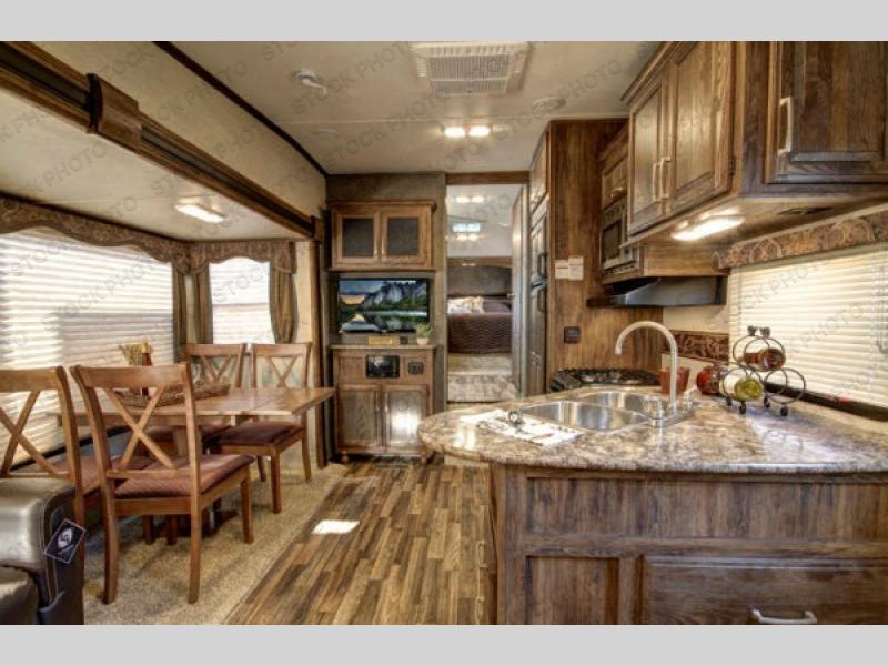 Straight in from the door find a tri-fold sleeper sofa and booth dinette slide, or you can choose an optional free-standing dinette in place of the booth dinette. The sofa features overhead cabinets for storage. There is an entertainment center near the slide that can easily be viewed from any seating in the room.