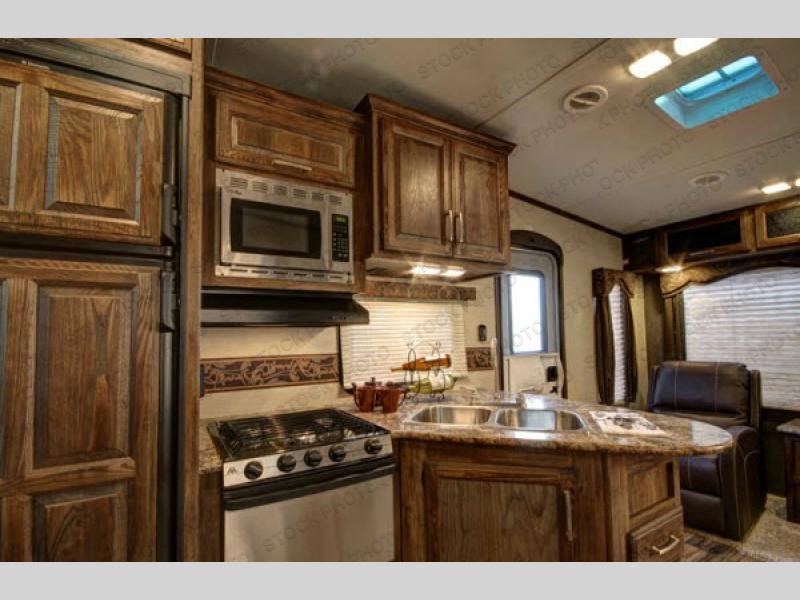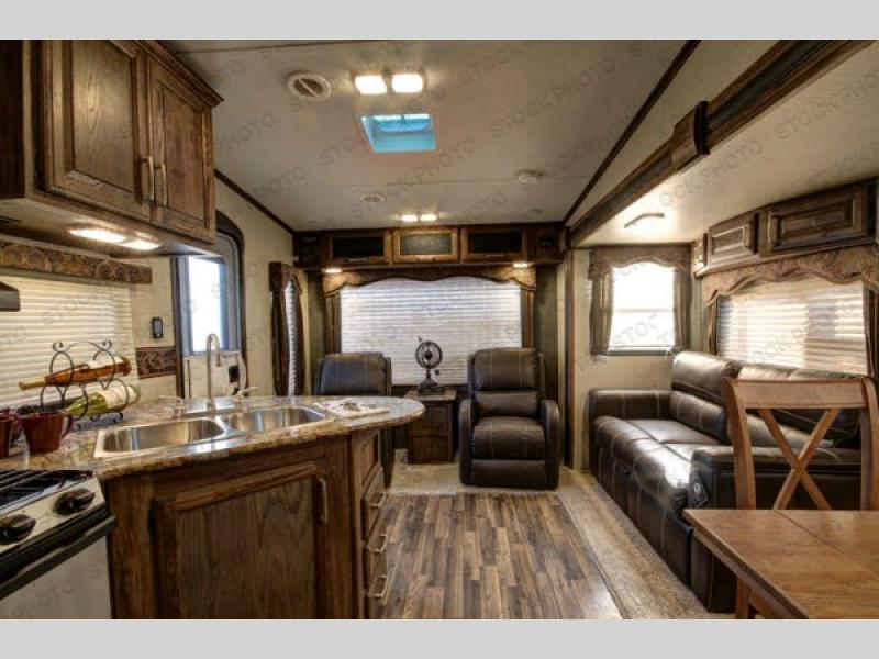 Step inside model 26RLS and notice the recliners across the rear of the unit. They feature an end table between the two and overhead cabinets above that stretch the entire width of the unit.