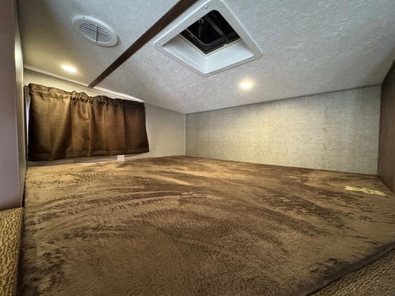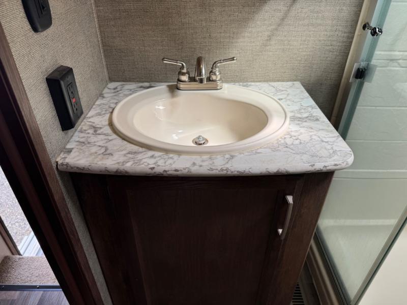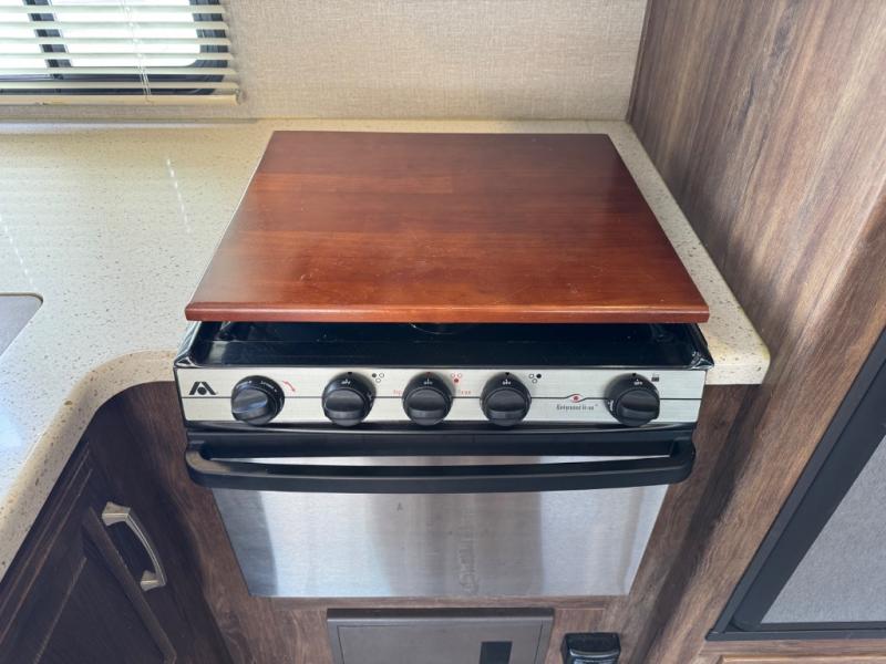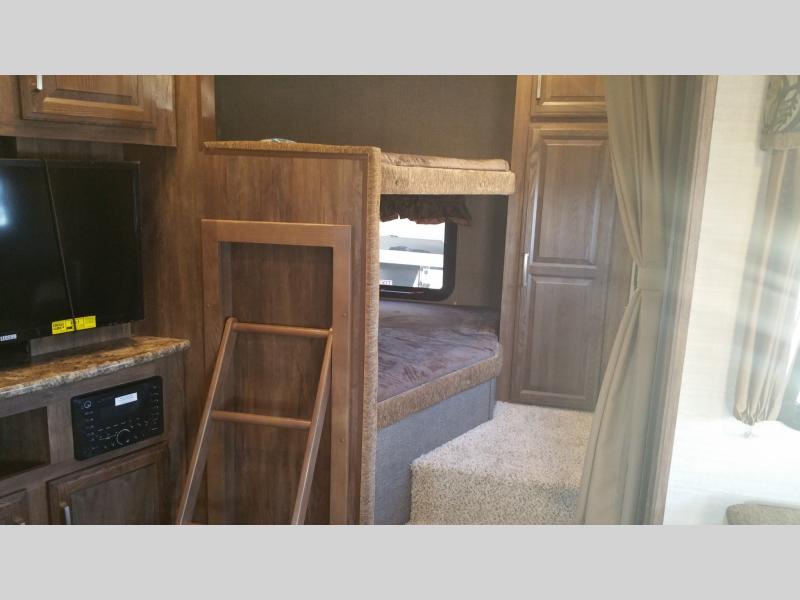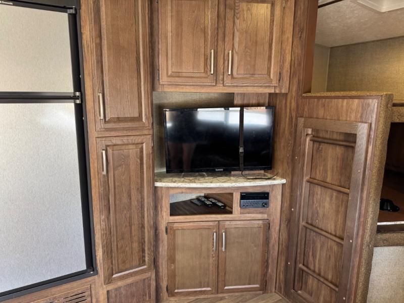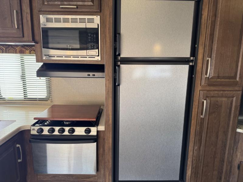 The kitchen area features an L-shaped countertop with a double sink, a three burner range, refrigerator, and a pantry. Next, you can enjoy the TV from the slide out or the kitchen area.