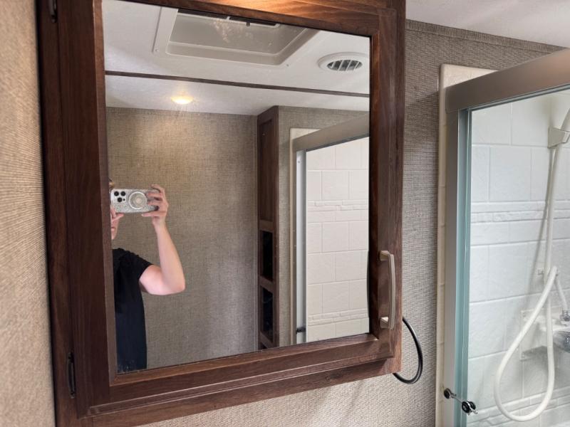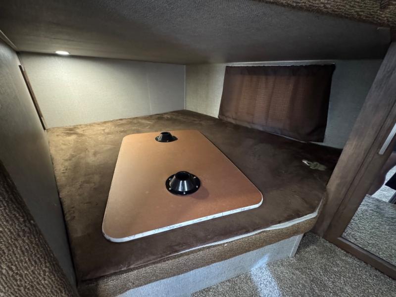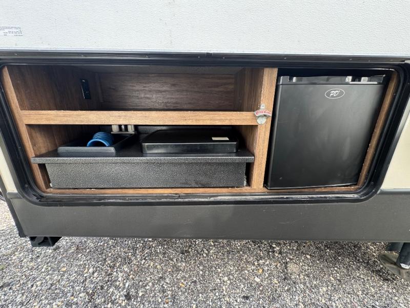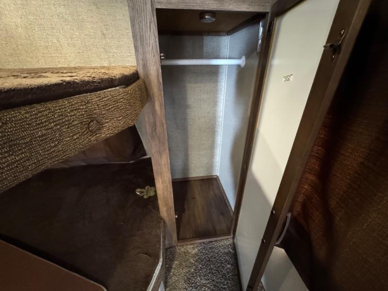 What I liked most: On the outside there is a fridge for beverages as well as a spot for TV to watch the game. You can choose to use either the ladder or the steps to get up to the bunks. These booths have their own storage drawers underneath. I like having the shoe rack and coat rack combo right when you walk in the door.