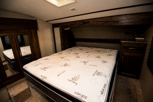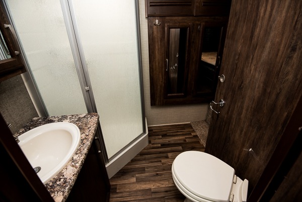 Step up to a front bed and bath area. The side aisle bath features a shower with seat, toilet, linen storage, and a sink with overhead cabinet.