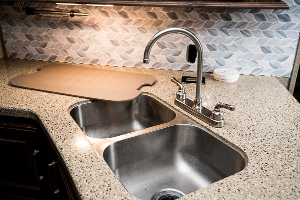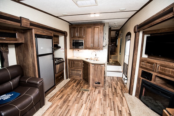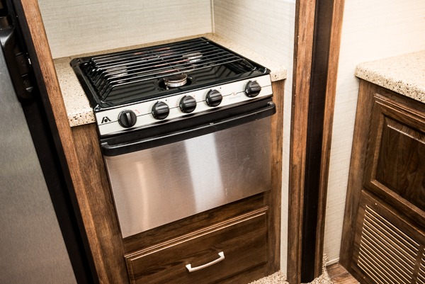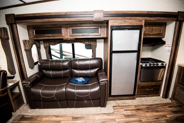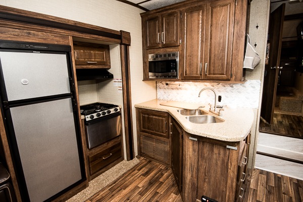 There is a tri-fold sleeper sofa, refrigerator, and three burner range slide opposite the door side. There is additional counter space along the interior wall that features plenty of prep space and includes a double sink in an angled part of the countertop, and overhead storage.