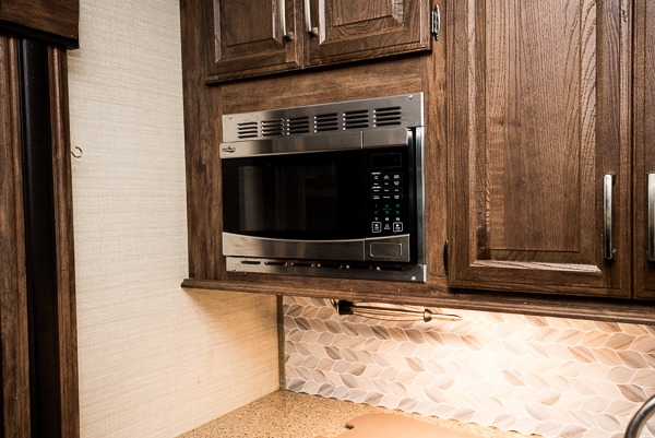 Along the rear wall find two recliners with an end table between, plus overhead storage the entire width of the unit.