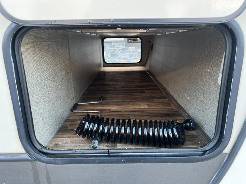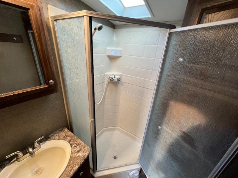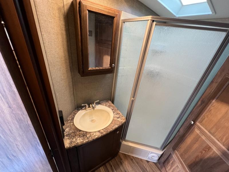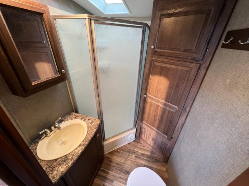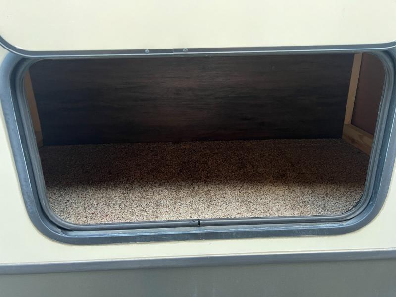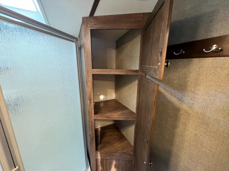 Just outside the bathroom door in the front find a private master bedroom with sliding door. The king bed slides out from the road side wall and includes overhead storage for your things. There is also a full front wardrobe with sliding doors, plus more storage opposite the bed with overhead cabinets as well.