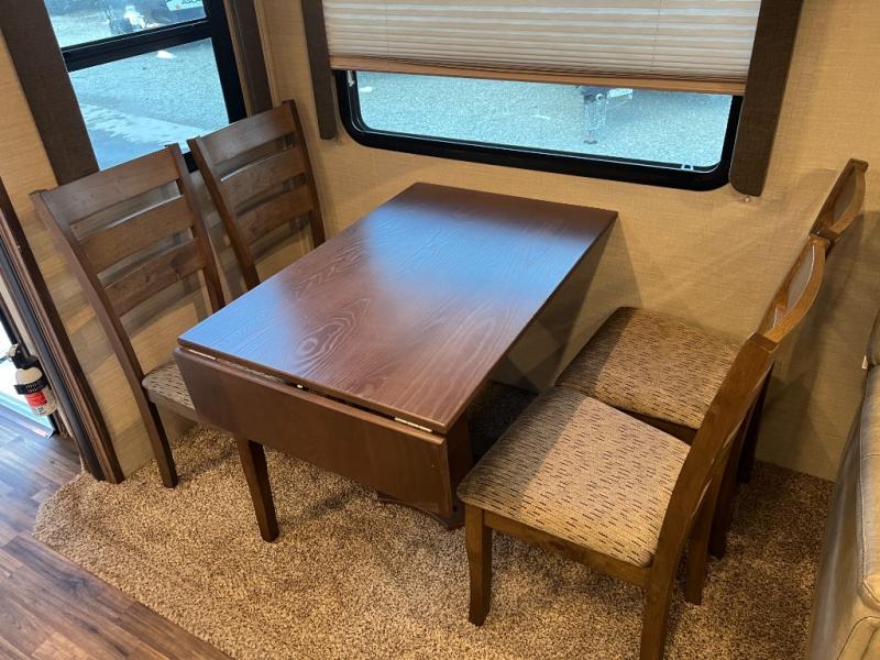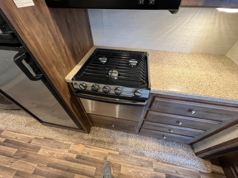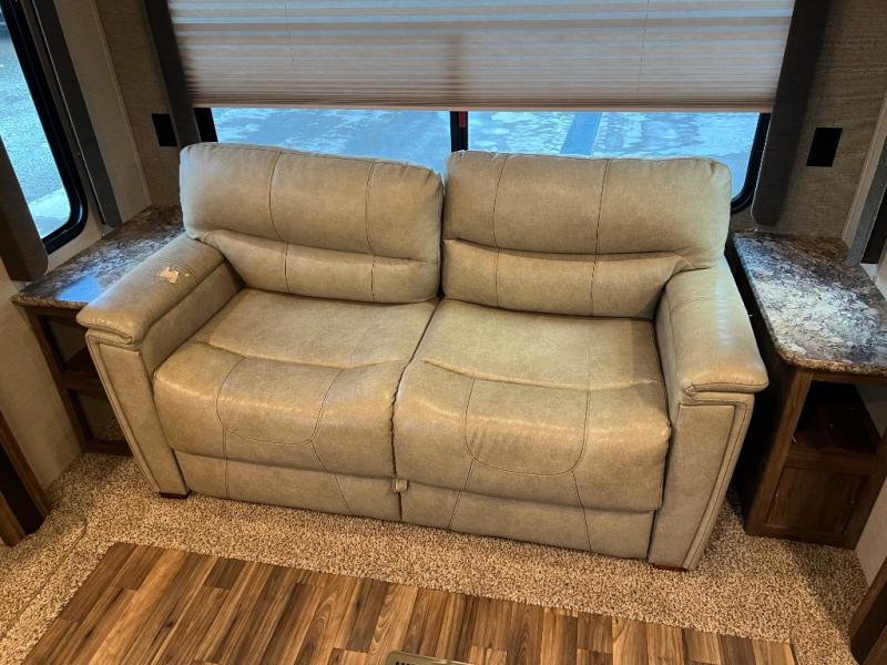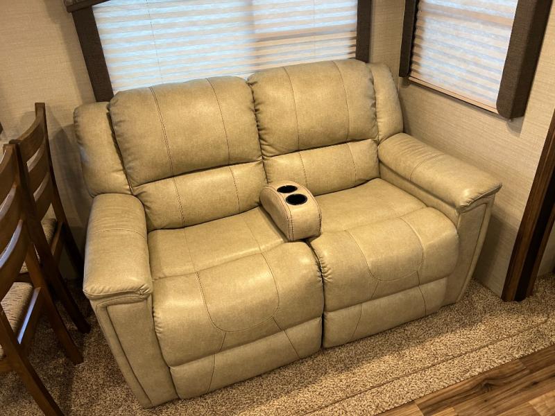 Back in the main living and kitchen space find a free standing dinette with theater seats, cup holders, and storage above, or you can choose an optional booth dinette and optional recliners. Continuing around to the rear wall find a tri-fold sleeper sofa with two end tables and storage above. The second slide in this area features an entertainment center, and the kitchen appliances. You will enjoy having extra sleeping space with the sleeper sofa for guests.