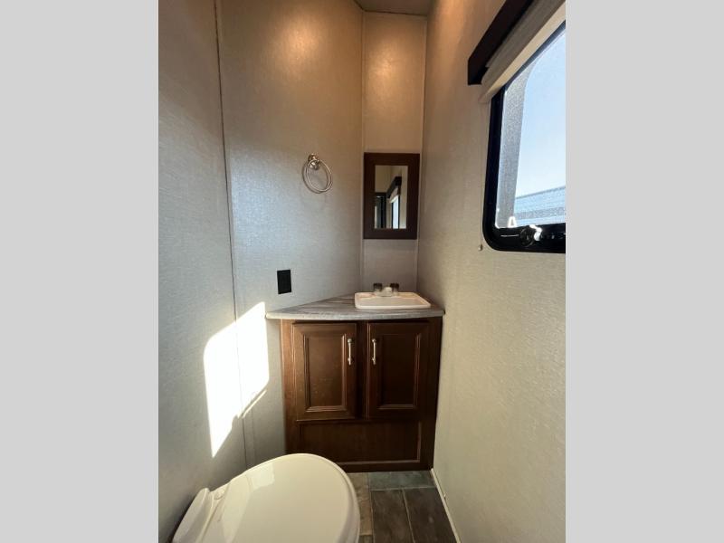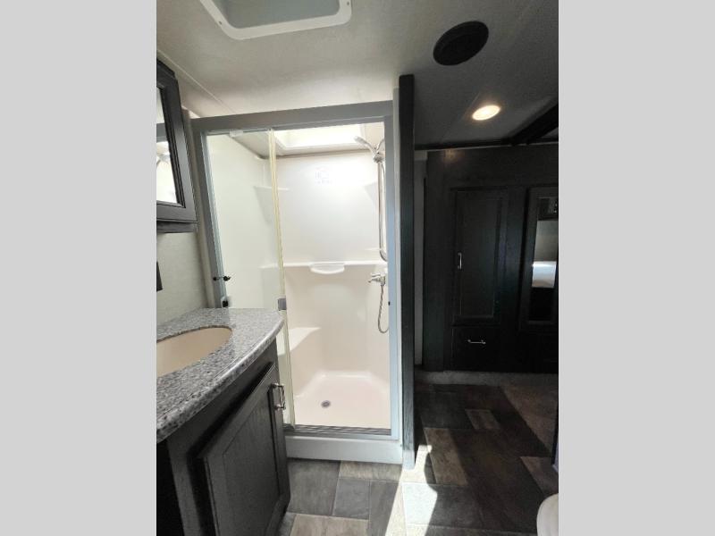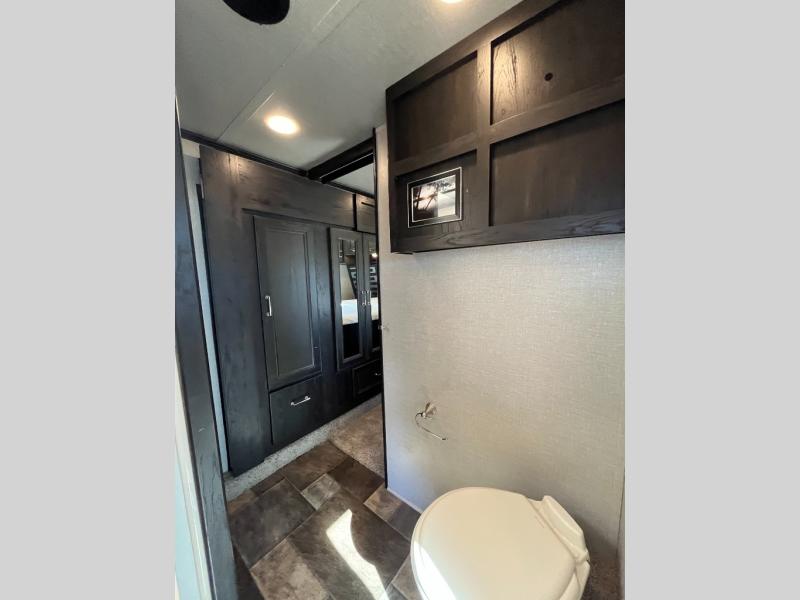 You will love the 8' rear ramp garage door for ease of loading your off-road toys. You will find in this garage area plenty of overhead cabinets for your gear, and a drop down top queen bed with dual opposing sofas in the rear cargo space for added sleeping and seating once things are unloaded at camp. There is also a loft in front, a space prepped for a washer and dryer if you choose to add, and a 40" LED TV. A convenient half bath is an added bonus so you can keep all the dirt and grime out of the main living quarters.