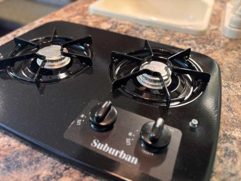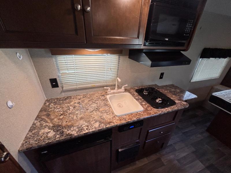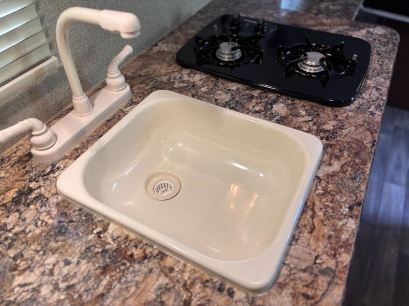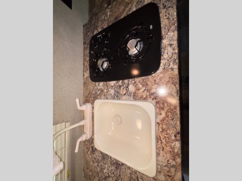 A booth dinette is located to the left of the entry door and features an overhead cabinet above. Across from the dinette you will find counter space, a single sink, and a two burner cook-top for light meals and snacks. There is plenty of storage with upper and lower storage for your things.