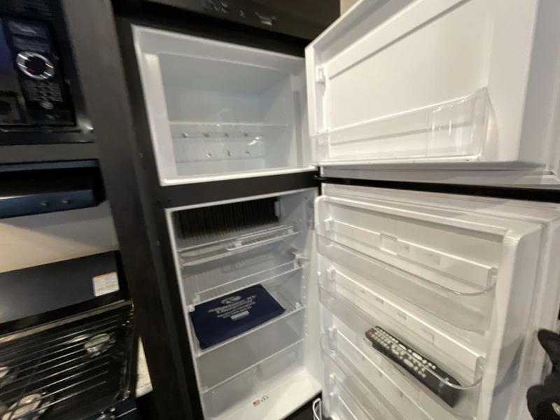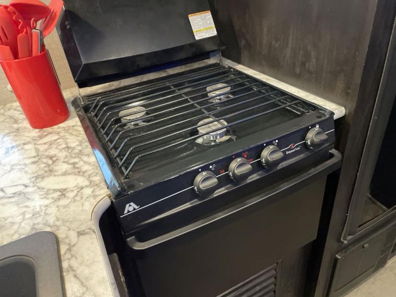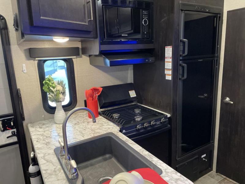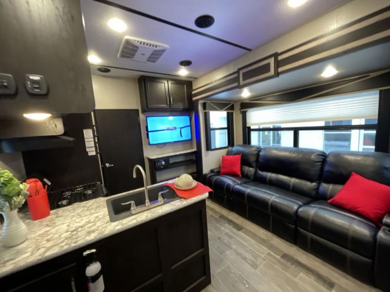 The kitchen and living room space feature a large slide out sofa, plus an entertainment center on the interior wall facing the front for easy viewing. There is a L-shaped counter area with overhead cabinets, a refrigerator, three burner range, kitchen sink for easy cleanup, and more overhead storage for dishes and things.