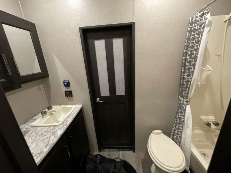 Move into the main living area through the interior man door, and find that the bathroom is a walk-thru with a sink, medicine cabinet, and linen storage on one side of the trailer. On the opposite side find a toilet and tub.