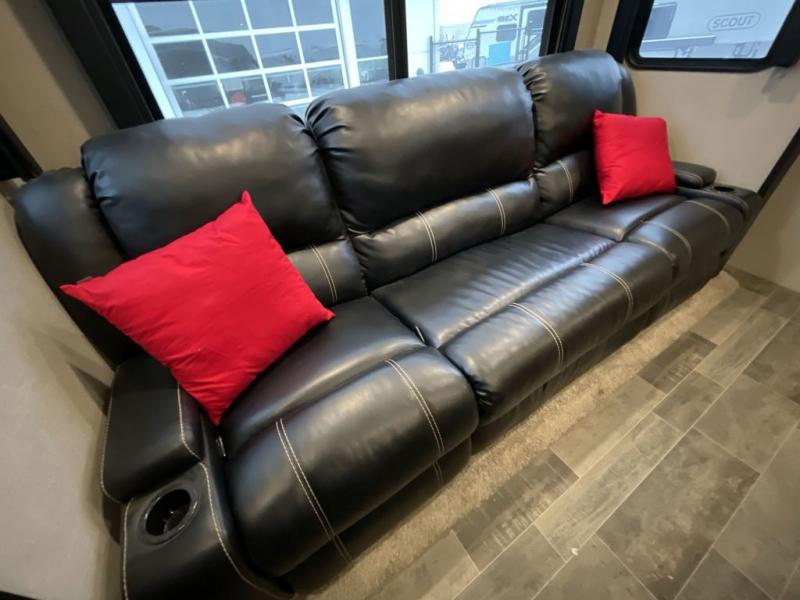 Step inside the rear 10' garage space and see how easy it will be to travel with a few toys. The 8' garage door will make loading and unloading a breeze. Once the rear door is closed you still have access to the cargo area from the outside using the side man door. There are two sofas opposite one another.