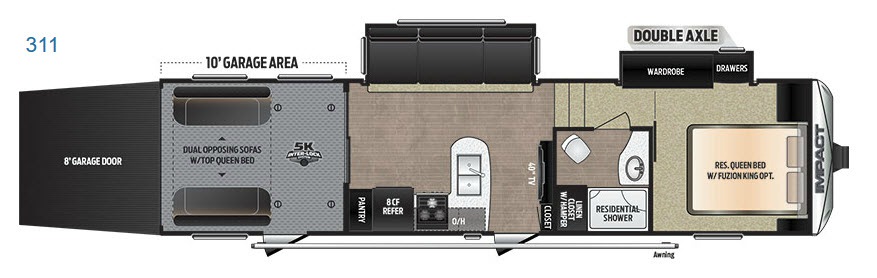 Pack up the toys and head to the playground of your choice in this Keystone Impact fifth wheel toy hauler model 311. With 10' of cargo area, and an 8' rear ramp door, loading and unloading won't take much time at all.