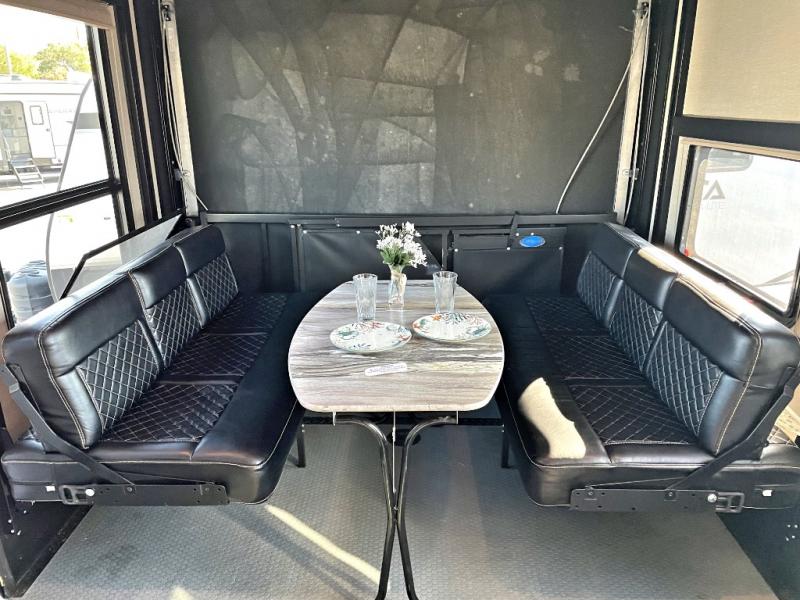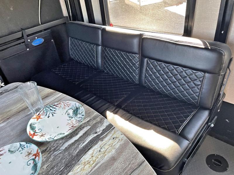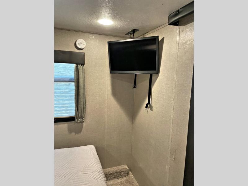 The cargo area features a second side entry door for access when the ramp door is closed. There is plenty of overhead cabinet space for storage. When the toys are unloaded you can enjoy dual opposing sofas with a top queen bed for more living and sleeping space for family or extra guests.