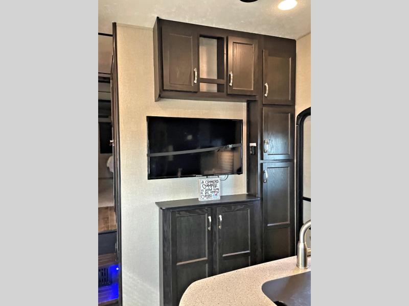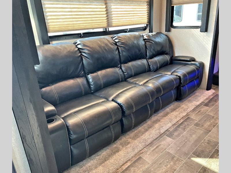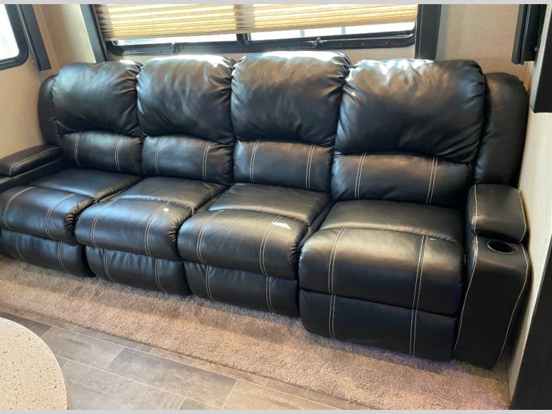 Head into the main living area through an interior door or second side entry in the center of the unit. There is a large slide out sofa for relaxing and hanging out, or watching the 40" TV across the room.