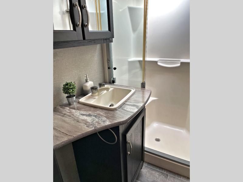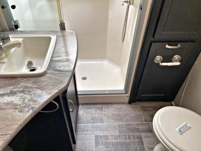 Step up to a bath with residential shower, toilet, linen closet with hamper, and sink. The bath has dual entry from the main living space and also from within the master suite up front.