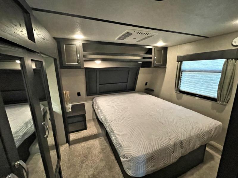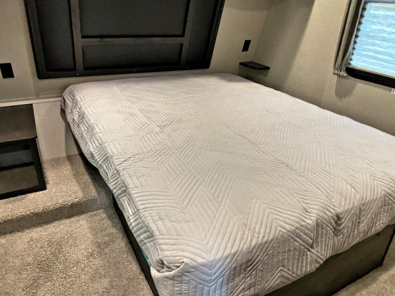 Access the front bedroom from a separate set of steps off to the side where you will find a wardrobe and drawers slide out on one side, and a residential queen bed or optional Fuzion king. There is overhead storage along with more storage on either side of the bed.