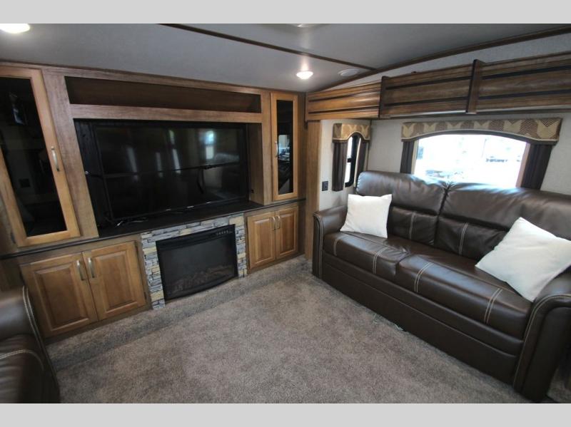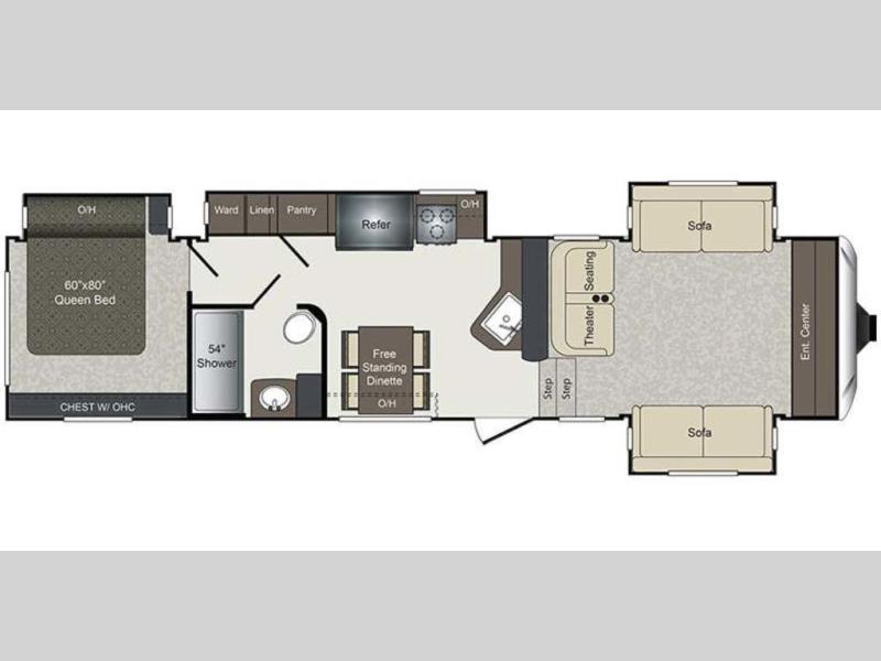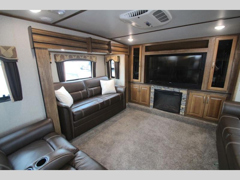 The dual slide outs in the front area makes it feel open and home like. With dual sofa slide outs across from each other, theater seating on the interior wall, and the front full wall entertainment center in this space, there is lots of room for relaxing, visiting, sleeping, or even watching the big game.
