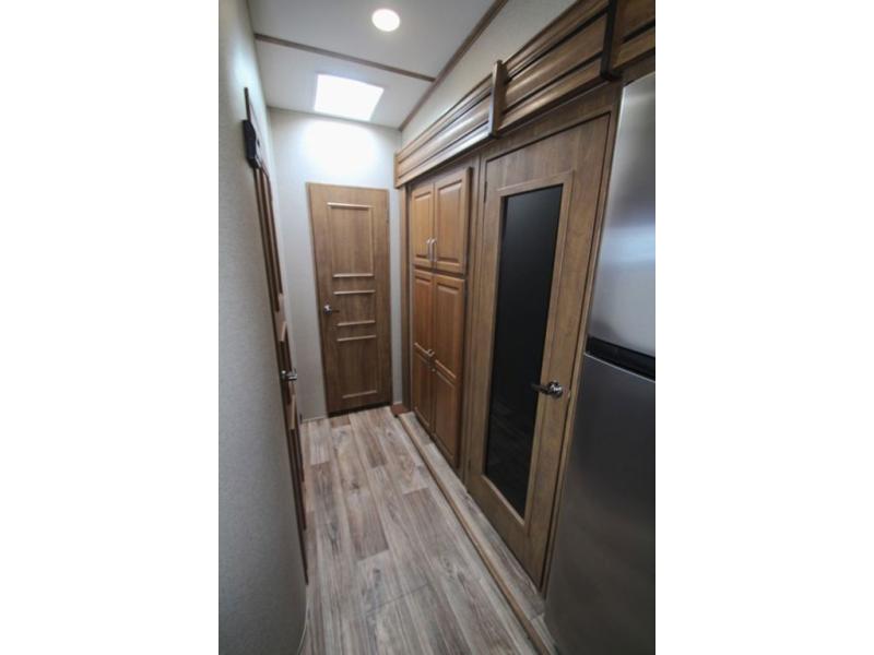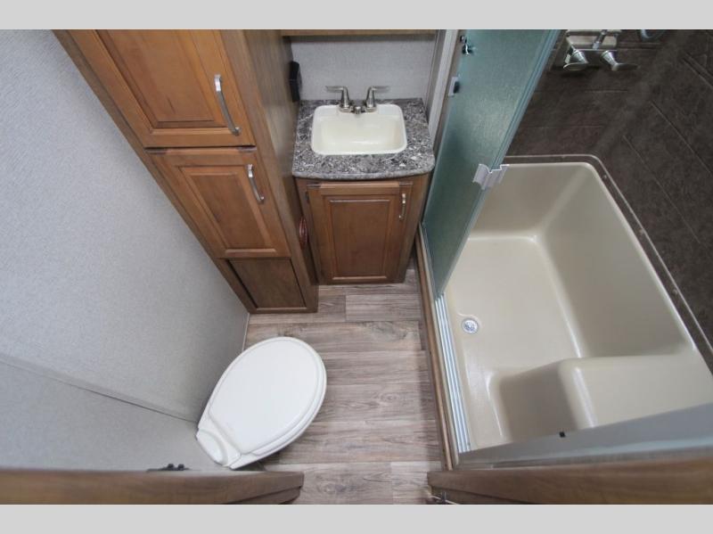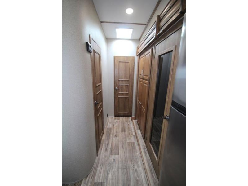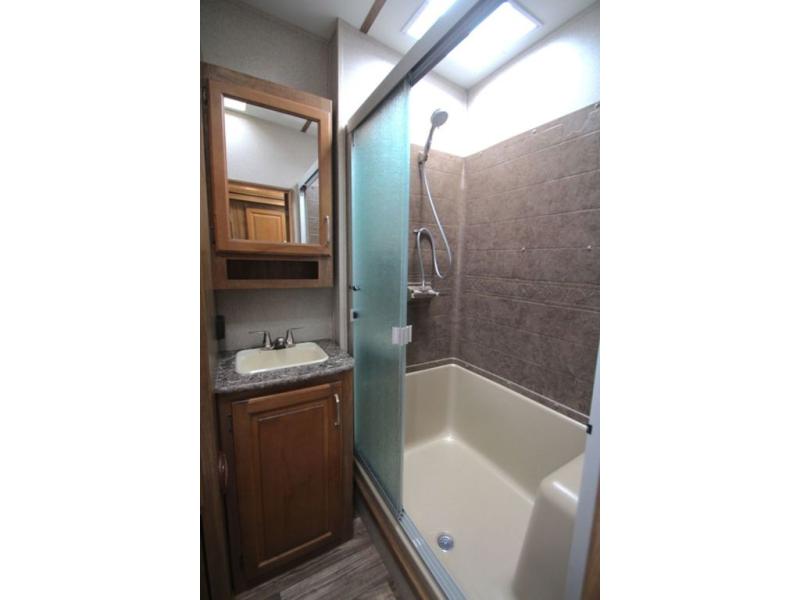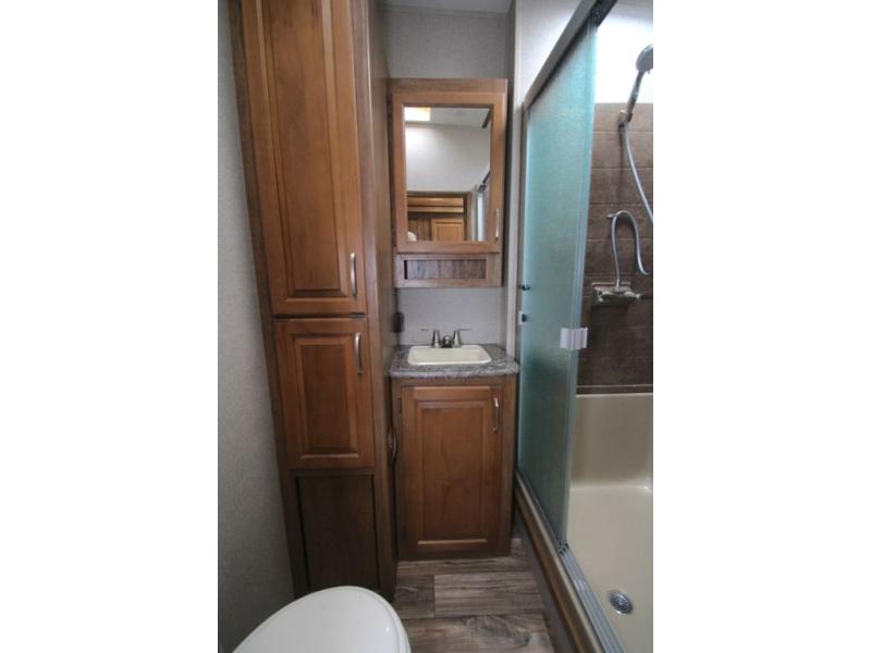 Heading towards the back there is a full bath on the left. The bath includes a shower, toilet, and a vanity with sink. Across from the bath is linen storage and a wardrobe that are included in the slide out with the kitchen amenities allowing more hallway space.
