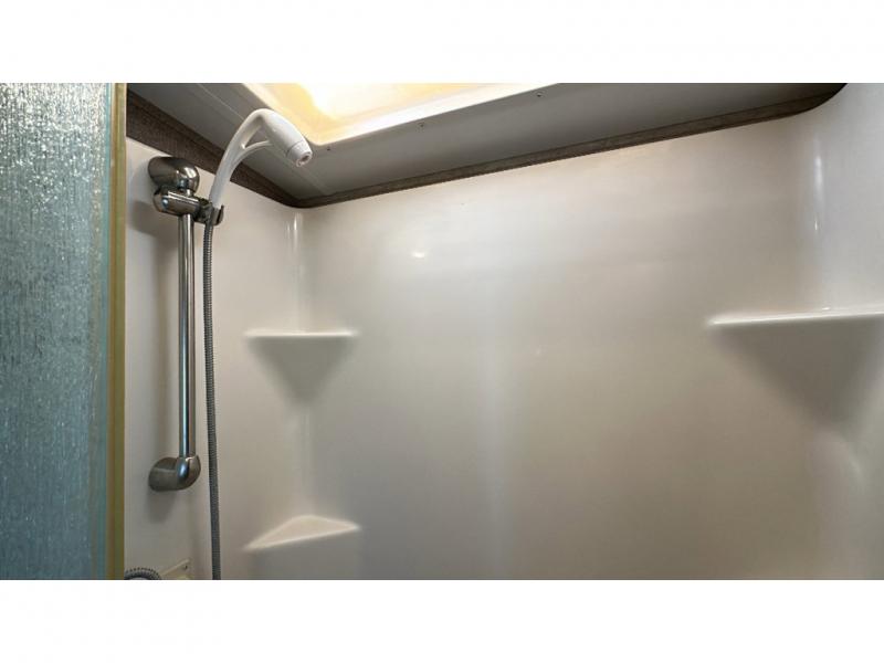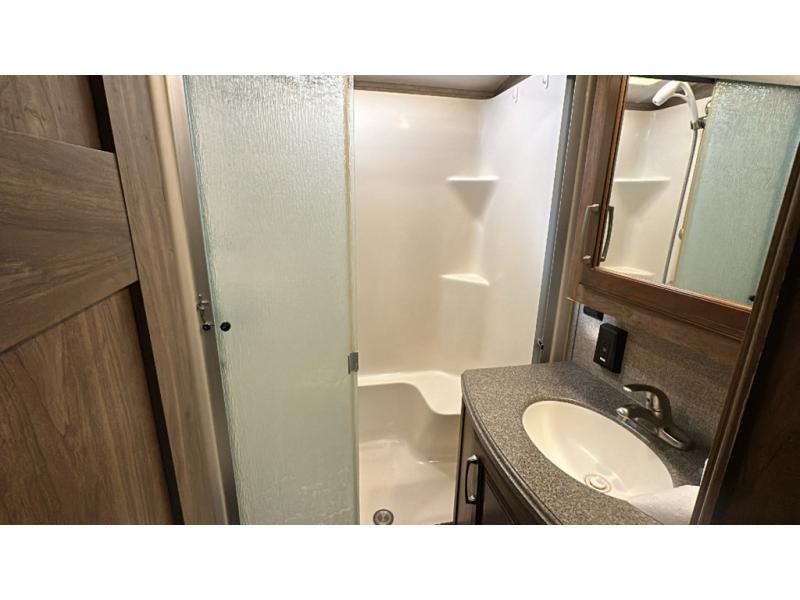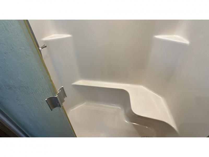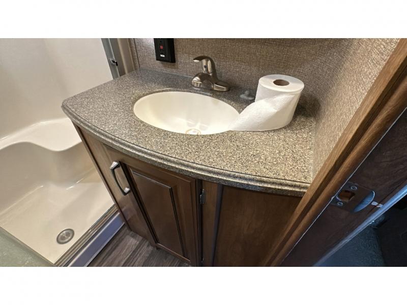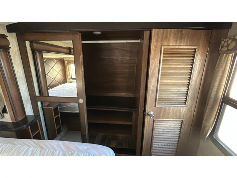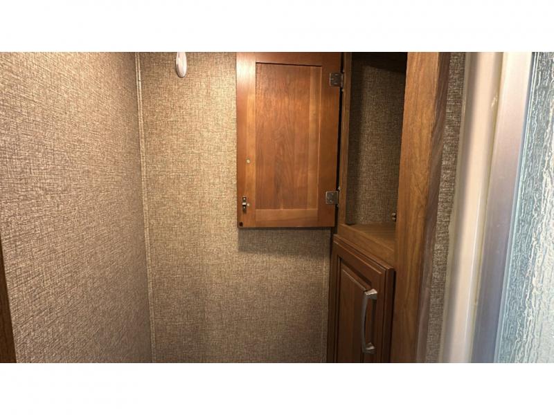 The front master bedroom provides ample space and a comfortable queen or optional king bed slide out. You will enjoy storage beneath the bed for extra things like blankets, or larger items like suitcases and things. You will also find a dresser opposite the bed with an HDTV above, plus a seating area along side. The front wall features a closet with space in the corner that has been prepped for a washer/dryer.