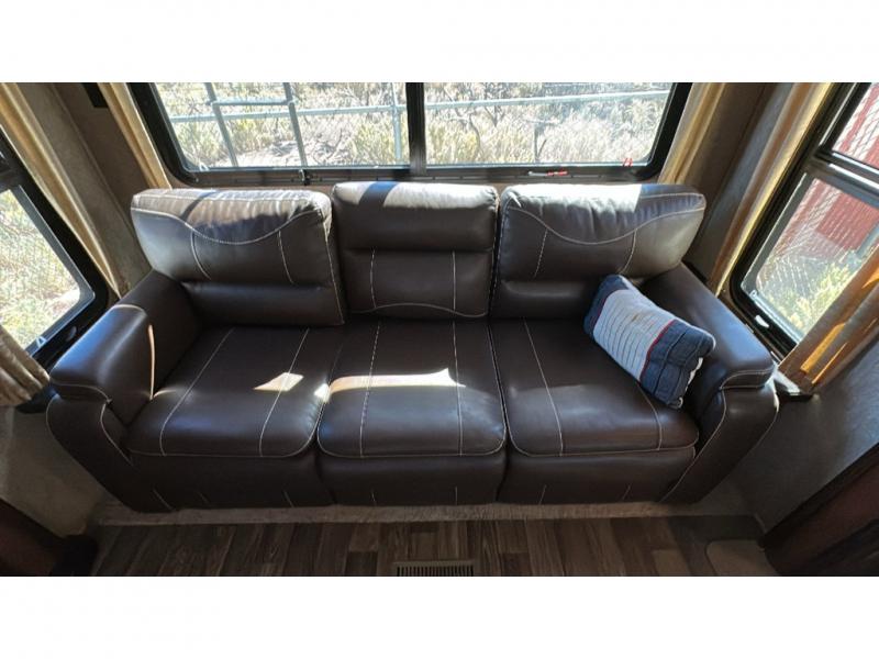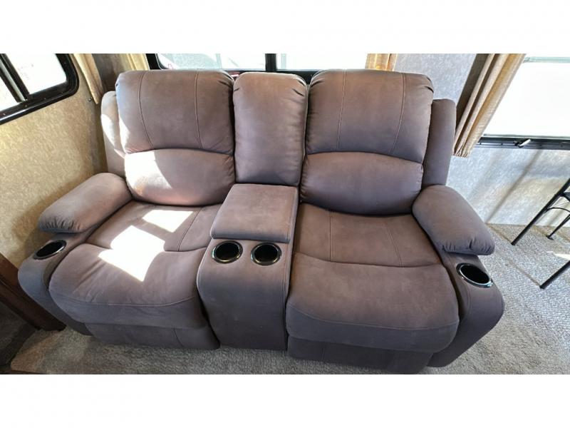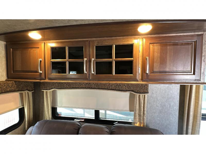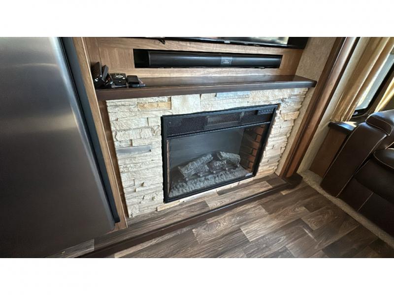 Step inside and see a spacious gathering place to the left of the door. There are dual slides that offer increased floor space giving you an at-home feel. There is a three burner range with convection microwave oven, a double door refrigerator, and an entertainment center with HDTV and fireplace in the slide out to the left of the entry door. You will also find a convenient kitchen island that offers counter food prep space and double sinks for cleaning up. The overhead cabinets, and lower cupboards and drawers will make storing your dishes easy too.